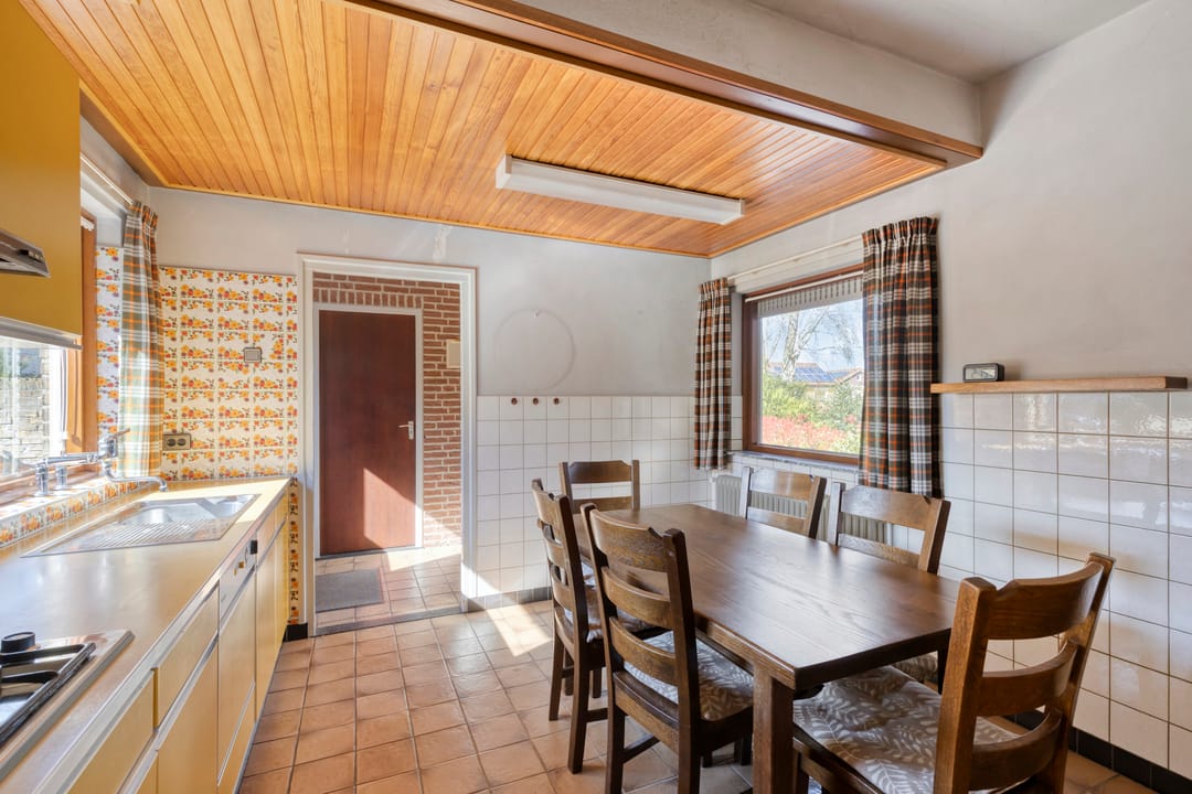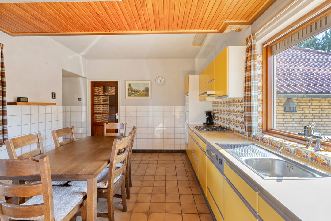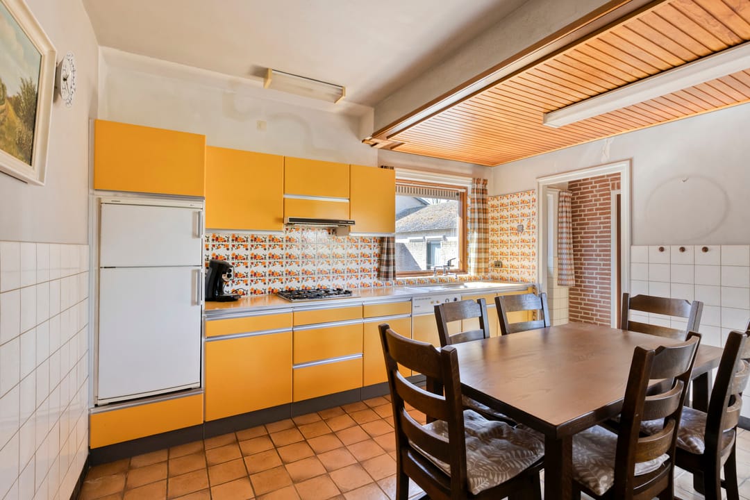 Aan het einde van de entree bereikt u de woonkeuken, het centrale punt van de woning. De keuken is voorzien van een kelder en een wandopstelling met onder andere een gasfornuis en biedt voldoende ruimte voor een praktische inrichting.