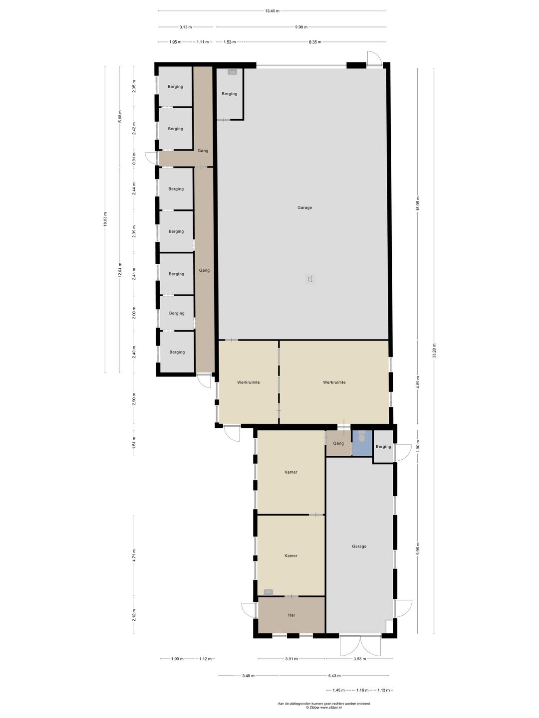 Aan de achterzijde van het gebouw bevindt zich de ruime garage-/loodsruimte met een grote open vloeroppervlakte, geschikt voor grotere voertuigen of opslag. De combinatie van werkruimten, kantoren, bergingen en garage-/loodsruimte maakt het geheel bijzonder veelzijdig in gebruik.