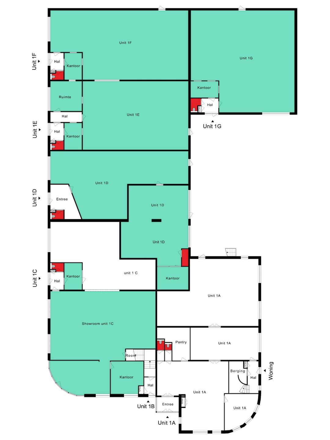 + Unit 1G, 1F en 1E zijn op dit moment intern met elkaar verbonden. Deze verbindingen zullen worden verwijderd, zodat alle units weer volledig zelfstandig worden opgeleverd.