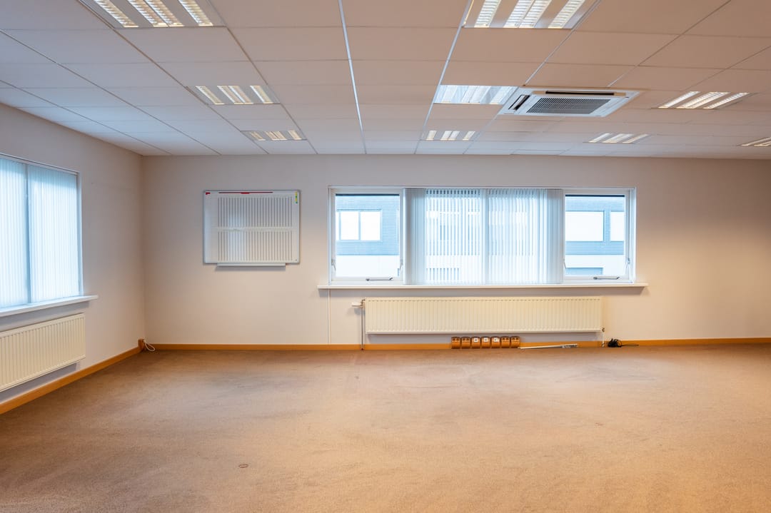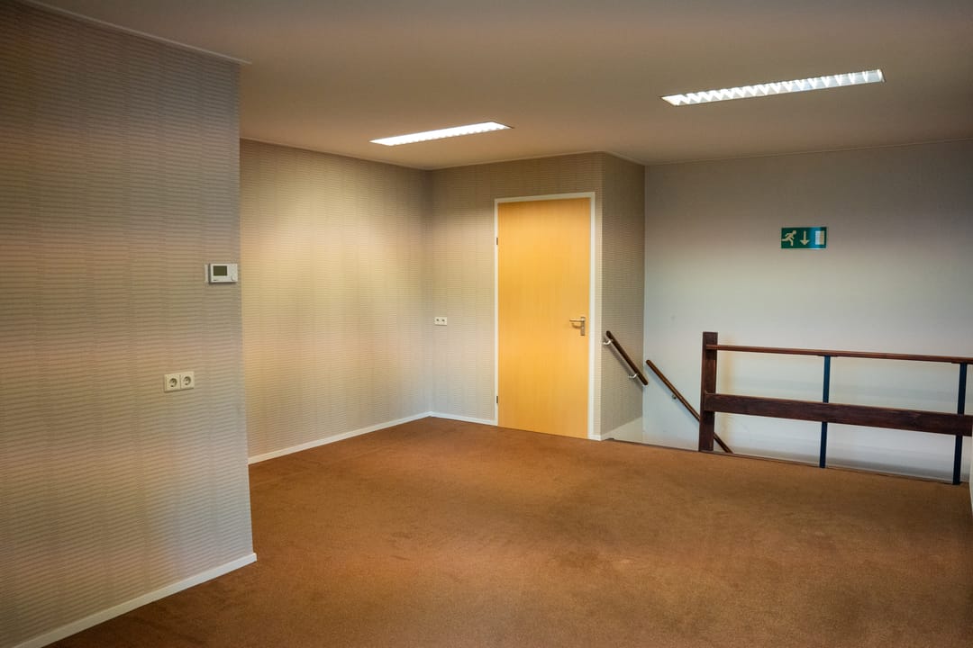 1e: Vanaf de overloop met moderne ontvangsthal bereikt u het toilet en het ruime kantoor. Vanuit dit kantoor bereikt u een afzonderlijk kantoorruimte die dienst kan doen als showroom, directiekantoor of vergaderruimte. Van hieruit heeft u toegang tot een afzonderlijke extra ruimte en zicht op de werkplaats op de begane grond. Het kantoor is voorzien van een systeemplafond, airco, verwarming en vloerbedekking.