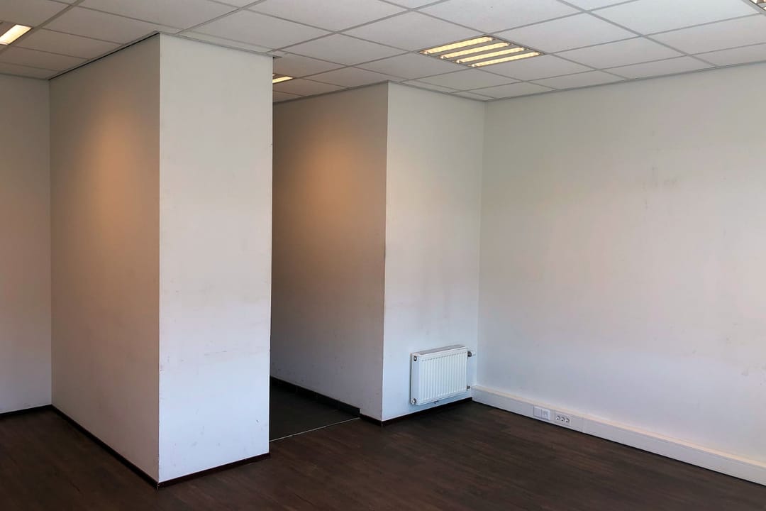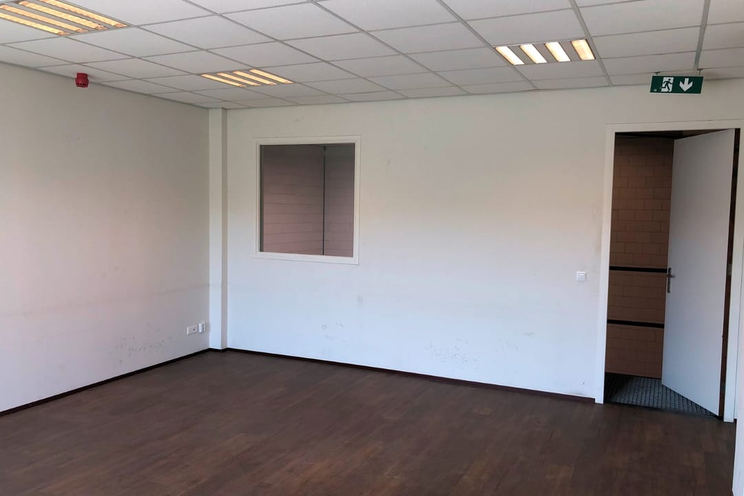 - kantoor metalstudwanden, houten binnendeurkozijnen met stompe deuren;
