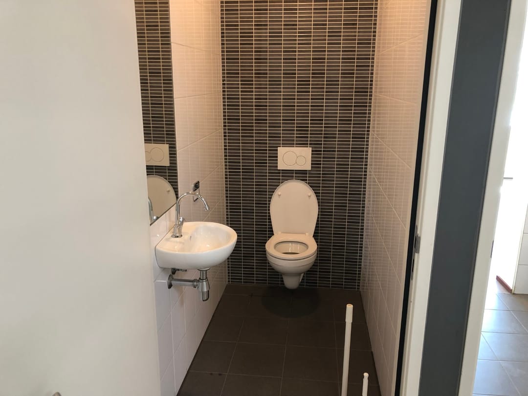 - luxe betegelde toiletruimte met wandcloset en fonteintje.
