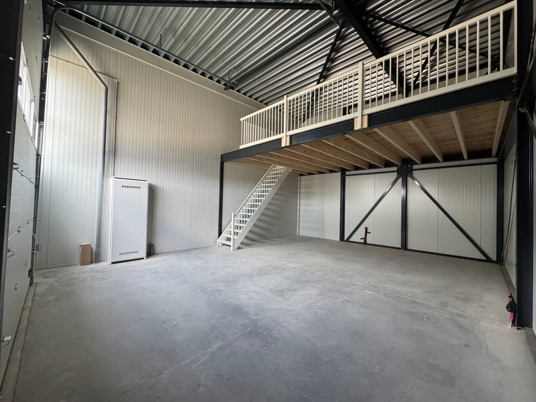 De begane grond beschikt over ca. 75 m² groot, zijnde 7,5 meter breed en 10 meter diep. De verdieping beschikt over ca. 37,5 m², zijnde 3,75 meter breed en 10 meter diep. De bedrijfsunit heeft een vrije hoogte van ca. 6 meter met een handbediende bediende overheaddeur en separate loopdeur. De bedrijfsunit beschikt over een betonnen begane grondvloer, elektrapunten, verlichtingsarmaturen en een eigen meterkast met nutsaansluitingen. Tevens beschikt de unit over een toiletvoorziening en een pantry met 2 bovenkastjes en close in boiler.