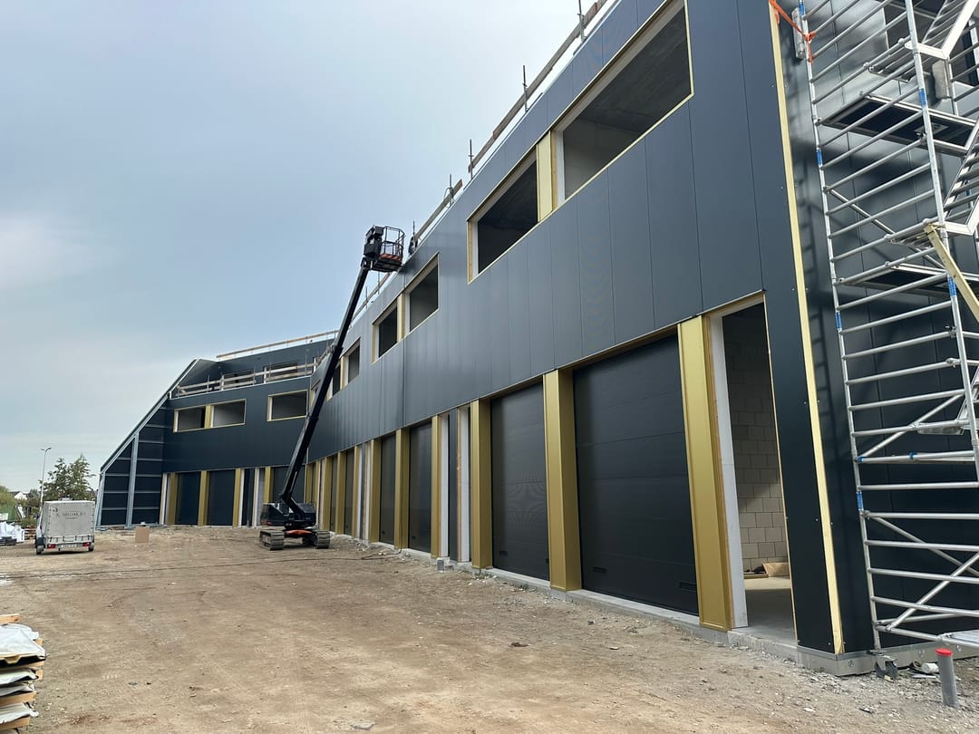 De gevels worden uitgevoerd in geïsoleerde sandwichpanelen in een donkergrijze kleur. Voor een deel van de gevel komt een net ten behoeve van begroeiing, gecombineerd met goud- of champagnekleurige geprofileerde panelen. Dankzij de toegepaste isolatielaag behalen de sandwichpanelen een isolatiewaarde van Rc 4,7 m²K/W. Alle panelen worden compleet geleverd met de benodigde lekdorpels, waterslagen, dakkappen, hoekstukken en aansluitdelen.