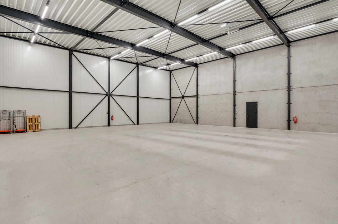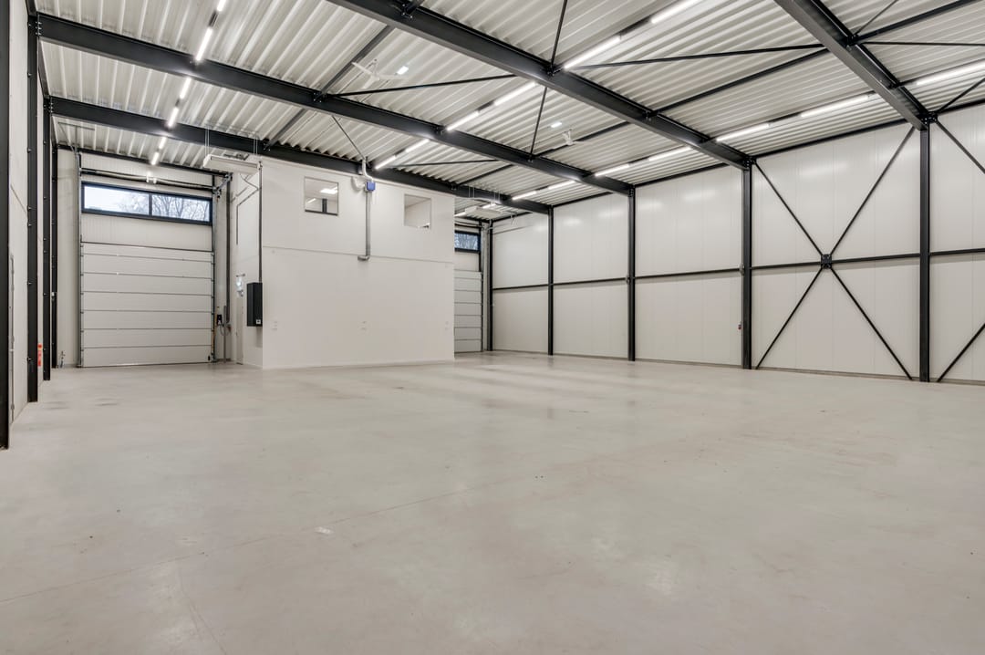 The business space on the ground floor has a surface area of approximately 362 m² and is finished with a concrete floor and an open layout. The space is accessible from both entrances and features a sectional door on both the left and right sides. In the hall, two electric heaters and two fans are present for the distribution of heat.
