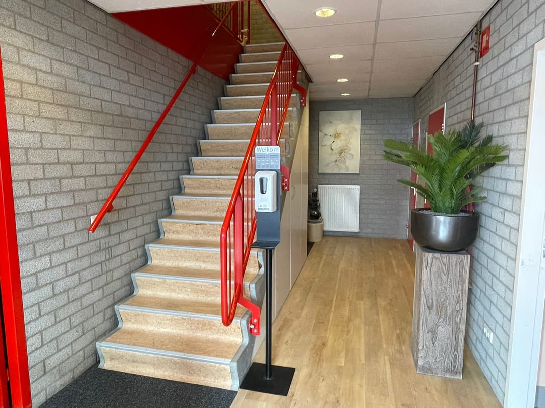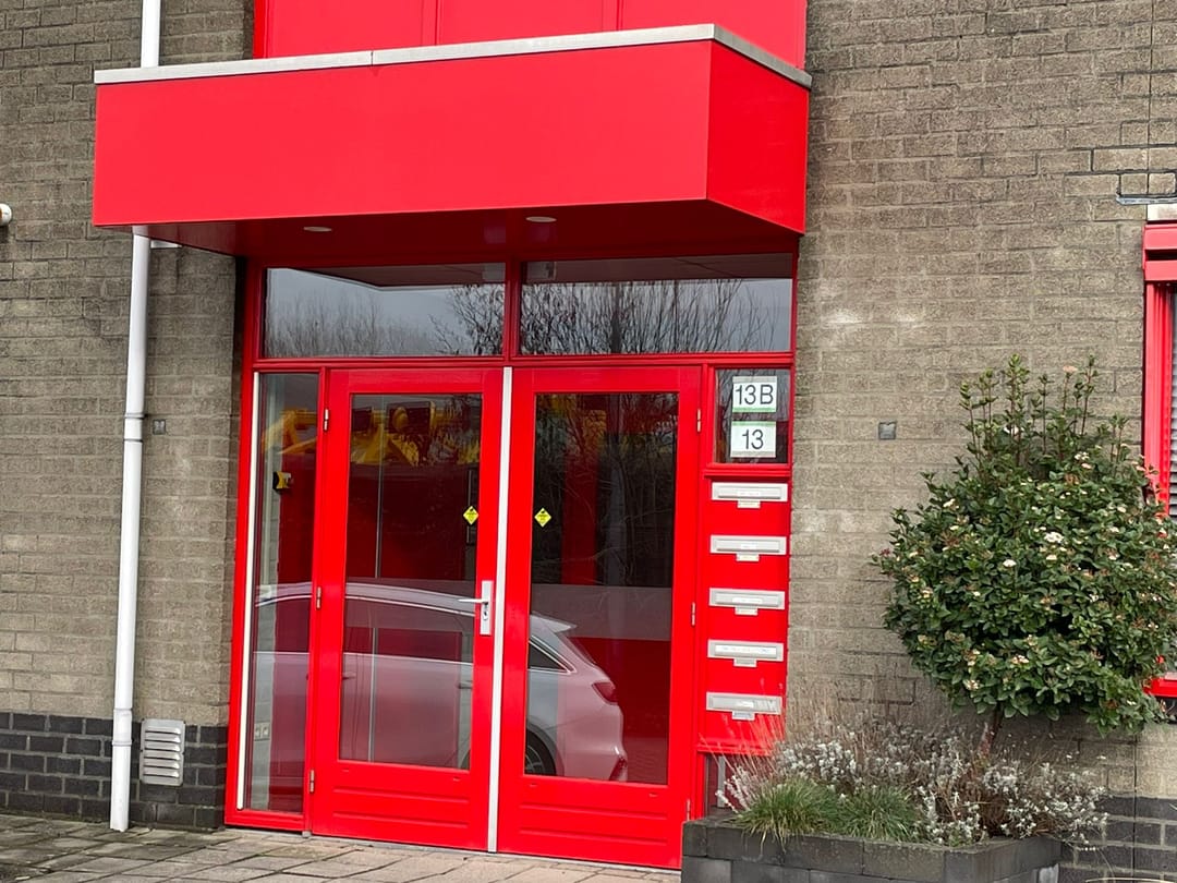 Het gebouw krijgt binnenkort een metamorfose, waarbij de bestaande rode kozijnen en deuren vervangen worden door een donkere (antraciet of zwarte) kleurstelling.