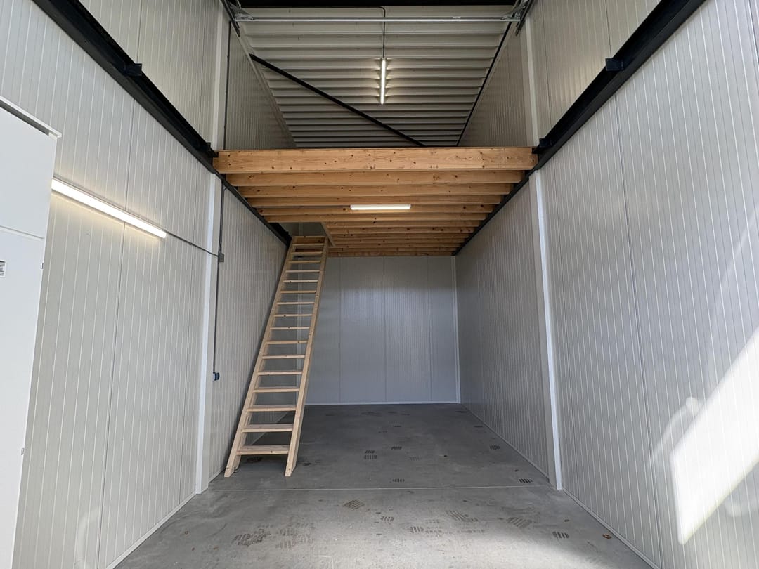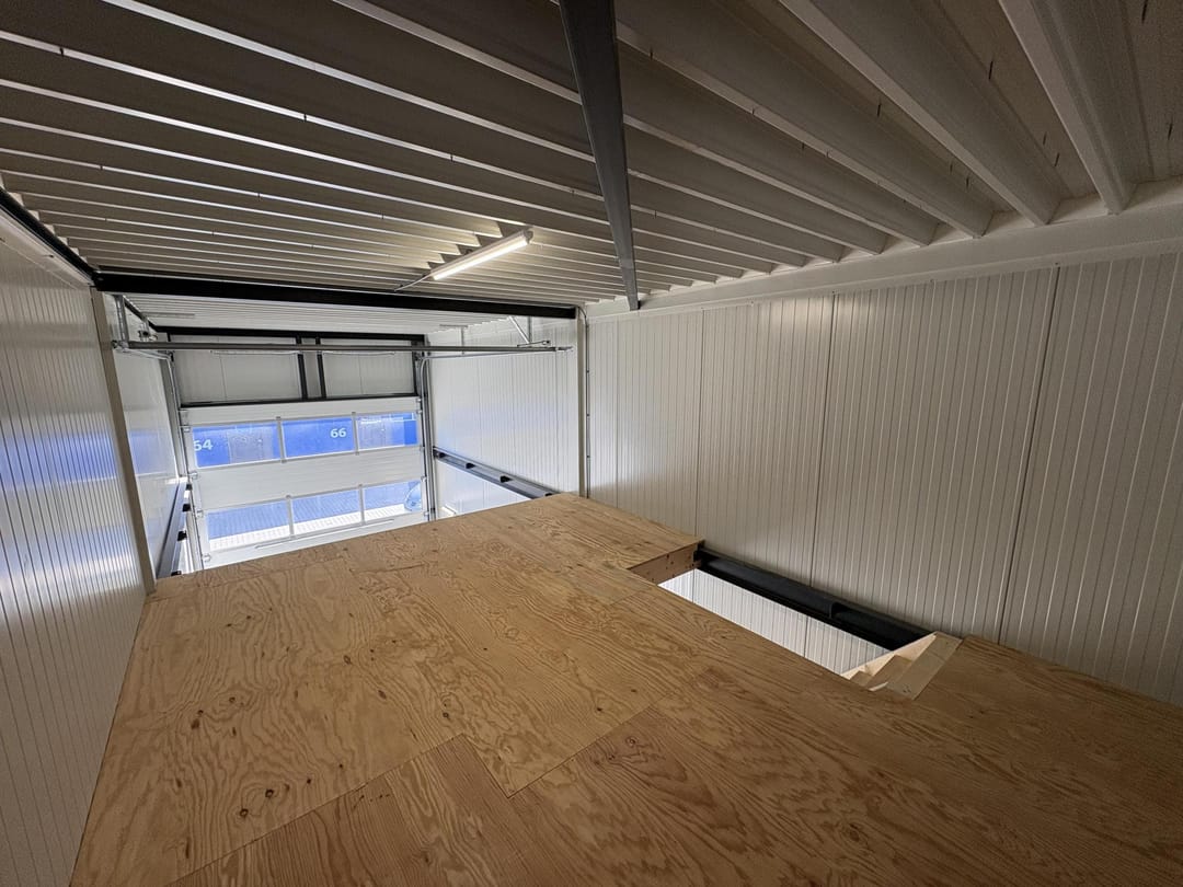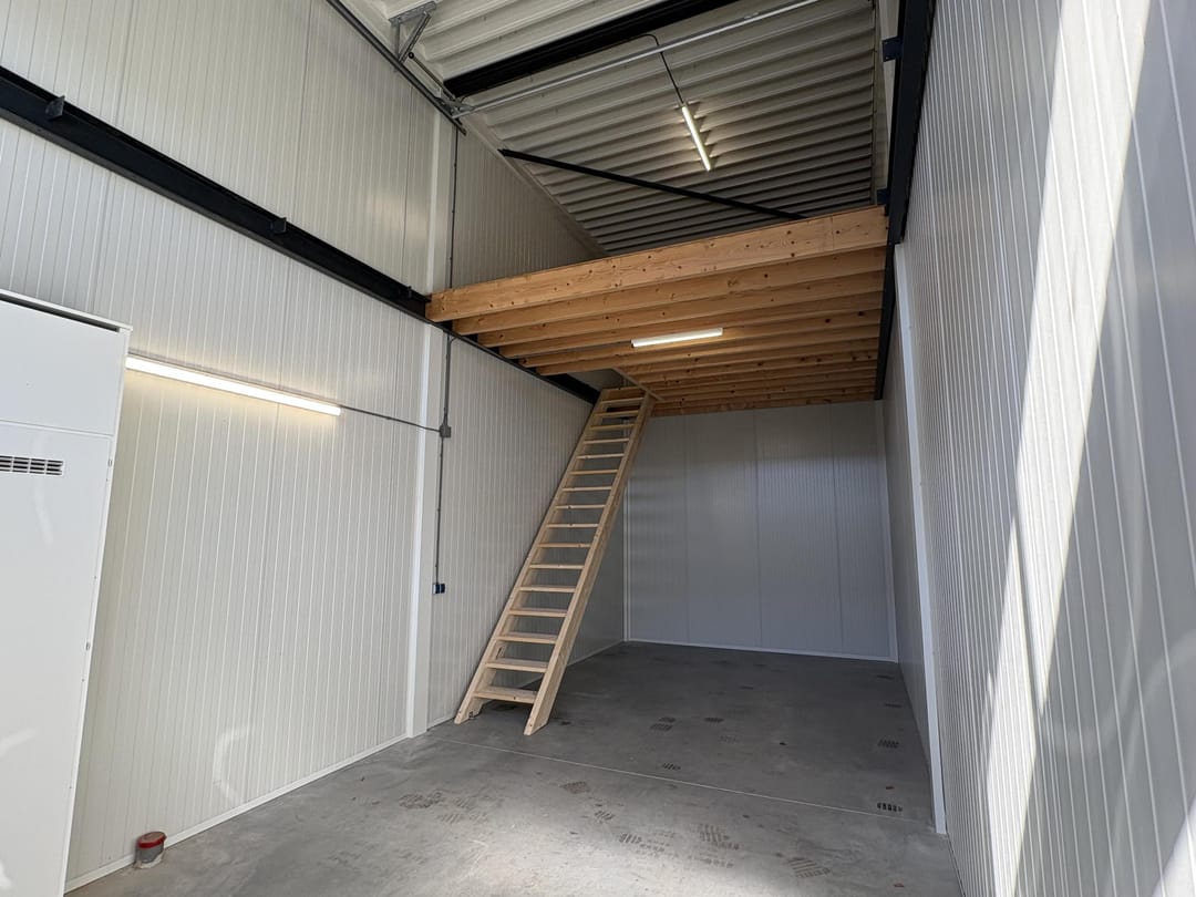 De begane grond bestaat uit een ruime werk- of opslagruimte van ca. 40 m², voorzien van een praktische overheaddeur. De unit beschikt over een houten verdiepingsvloer en energiezuinige Ledverlichting, waardoor het zowel duurzaam als prettig in gebruik is. Met 3x 25 Ampère elektriciteit is de unit geschikt voor uiteenlopende bedrijfsactiviteiten.