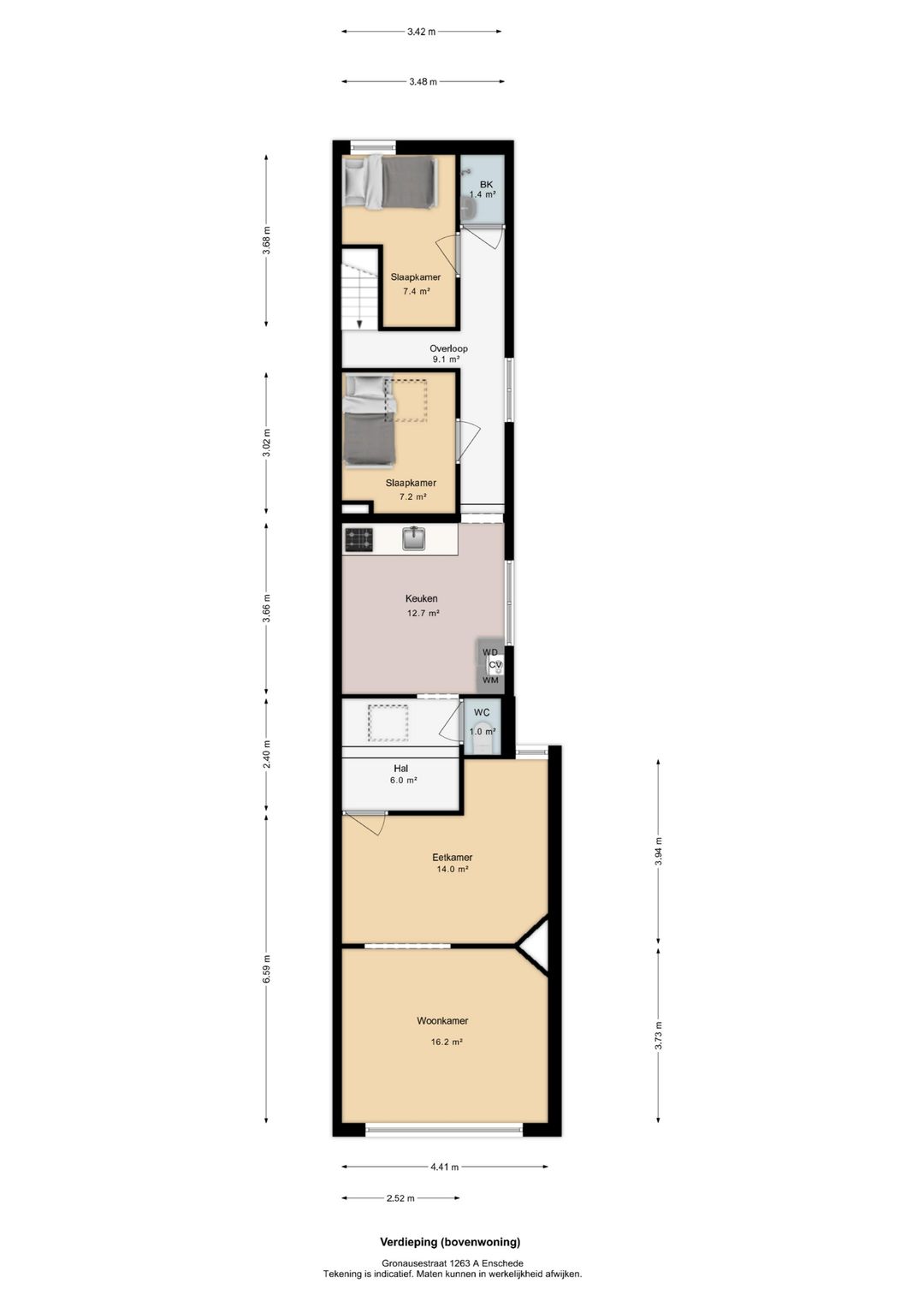 - Bovenwoning van ca. 71 m² (woonoppervlakte), bestaande uit woonkamer, keuken, 2 slaapkamers, badkamer (douche) en separaat toilet