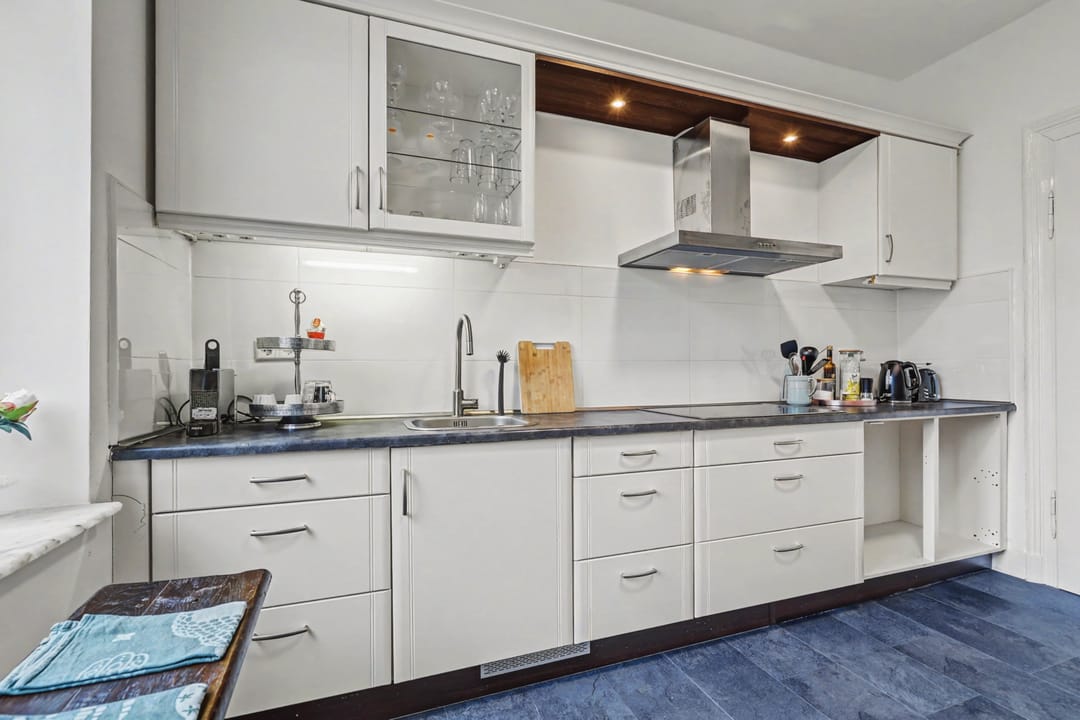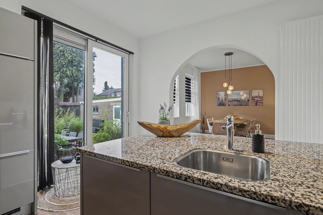 Leefkeuken: ca. 4,51 x 3,82 m, met royale schuifpui naar het terras en luxe hoogglans keukeninrichting met spoel-/werkeiland. Voorzien van hoogwaardige apparatuur, waaronder koelkast met vershoudlades, 4-lades vriezer, 6-pits gasfornuis (SMEG) met oven, inductiekookplaat, vaatwasser, combi-oven en RVS afzuigkap.