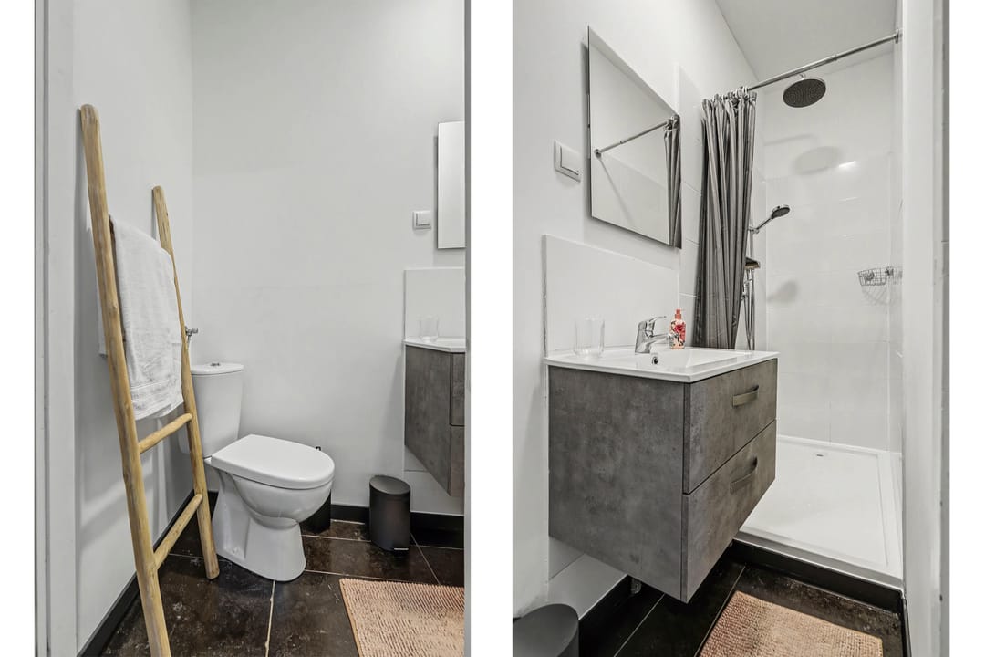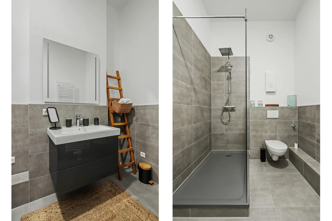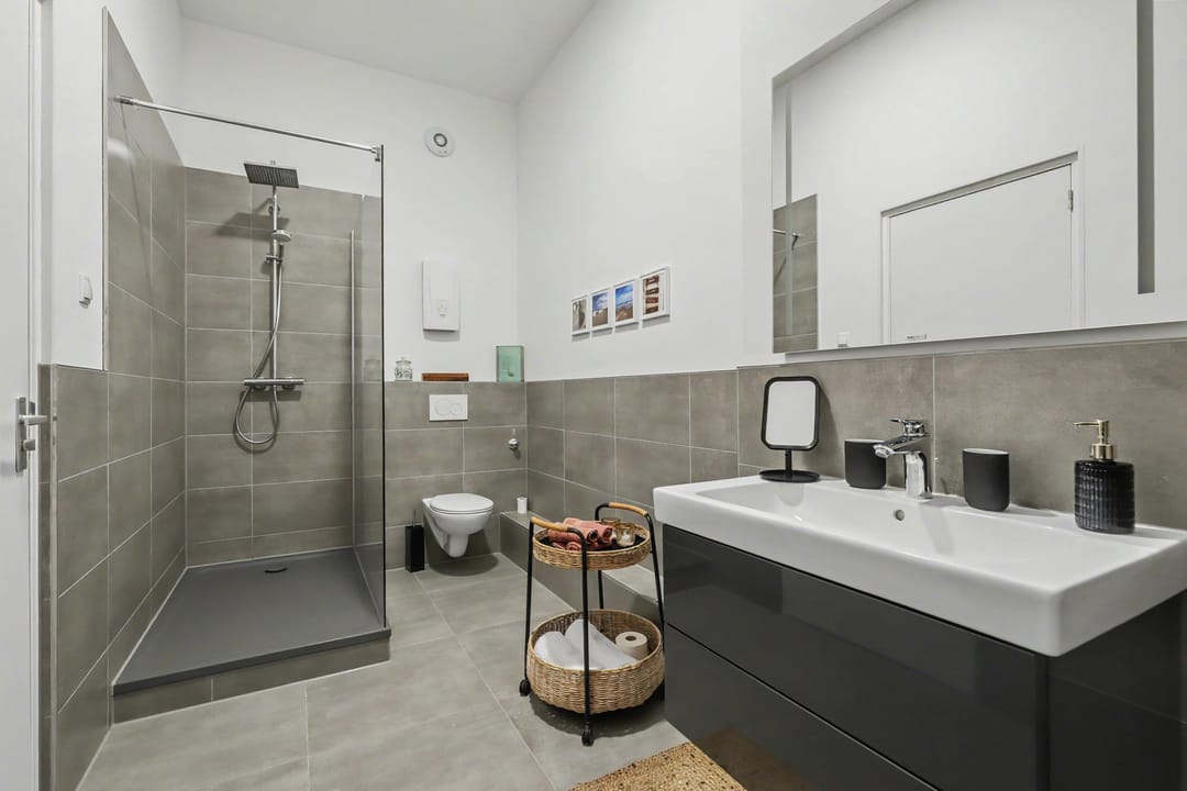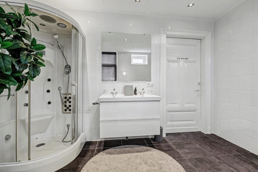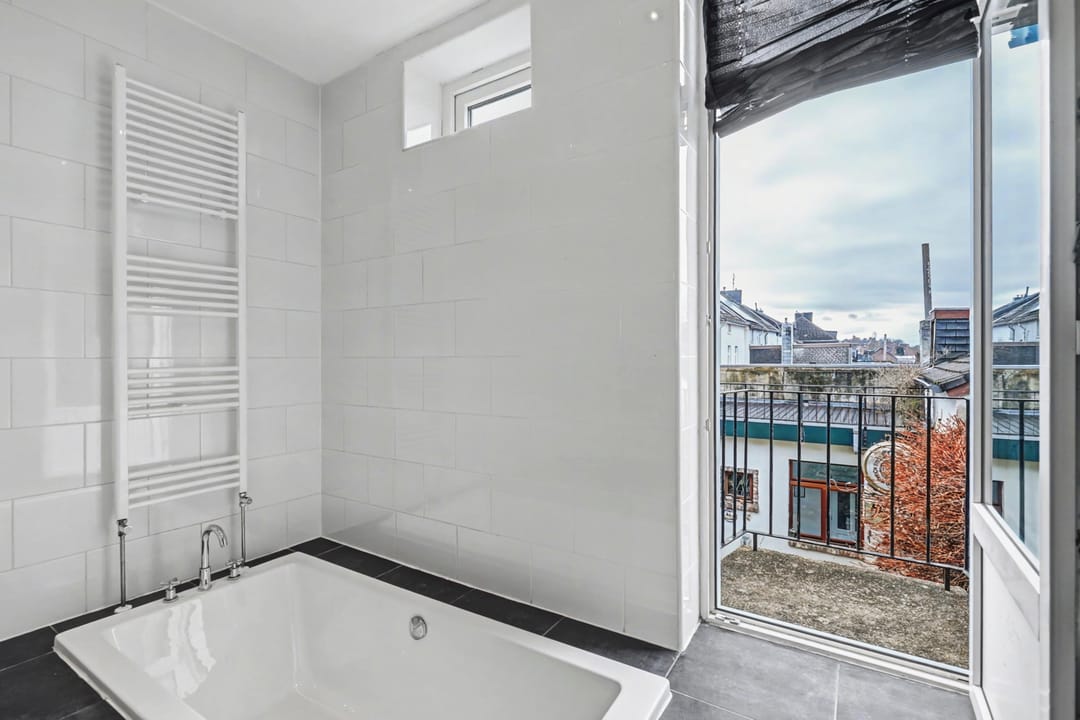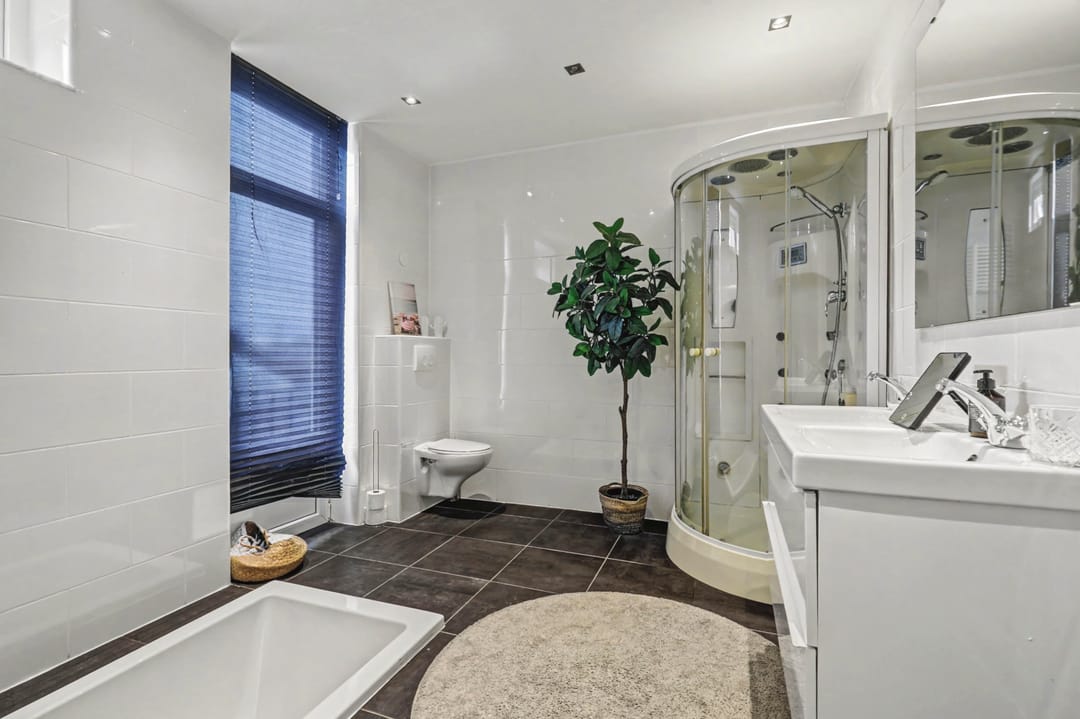 Badkamer: ca. 3,67 x 2,79 m, volledig betegeld en uitgerust met verzonken ligbad, douchecabine, dubbele wastafel met meubel en designradiator.