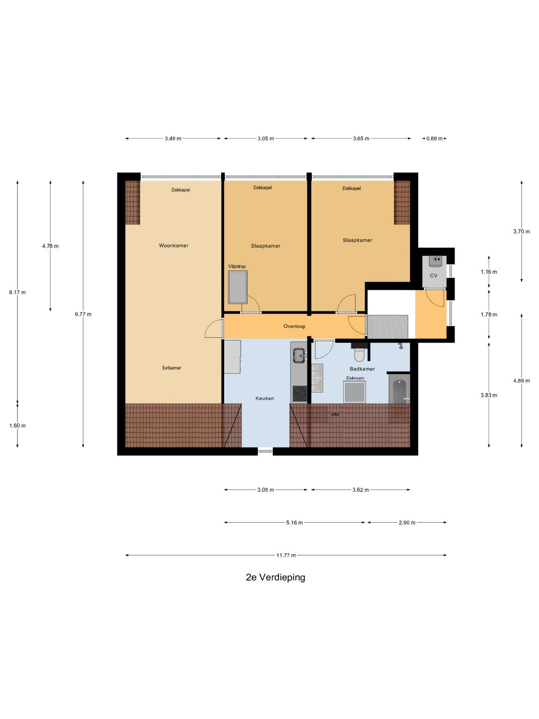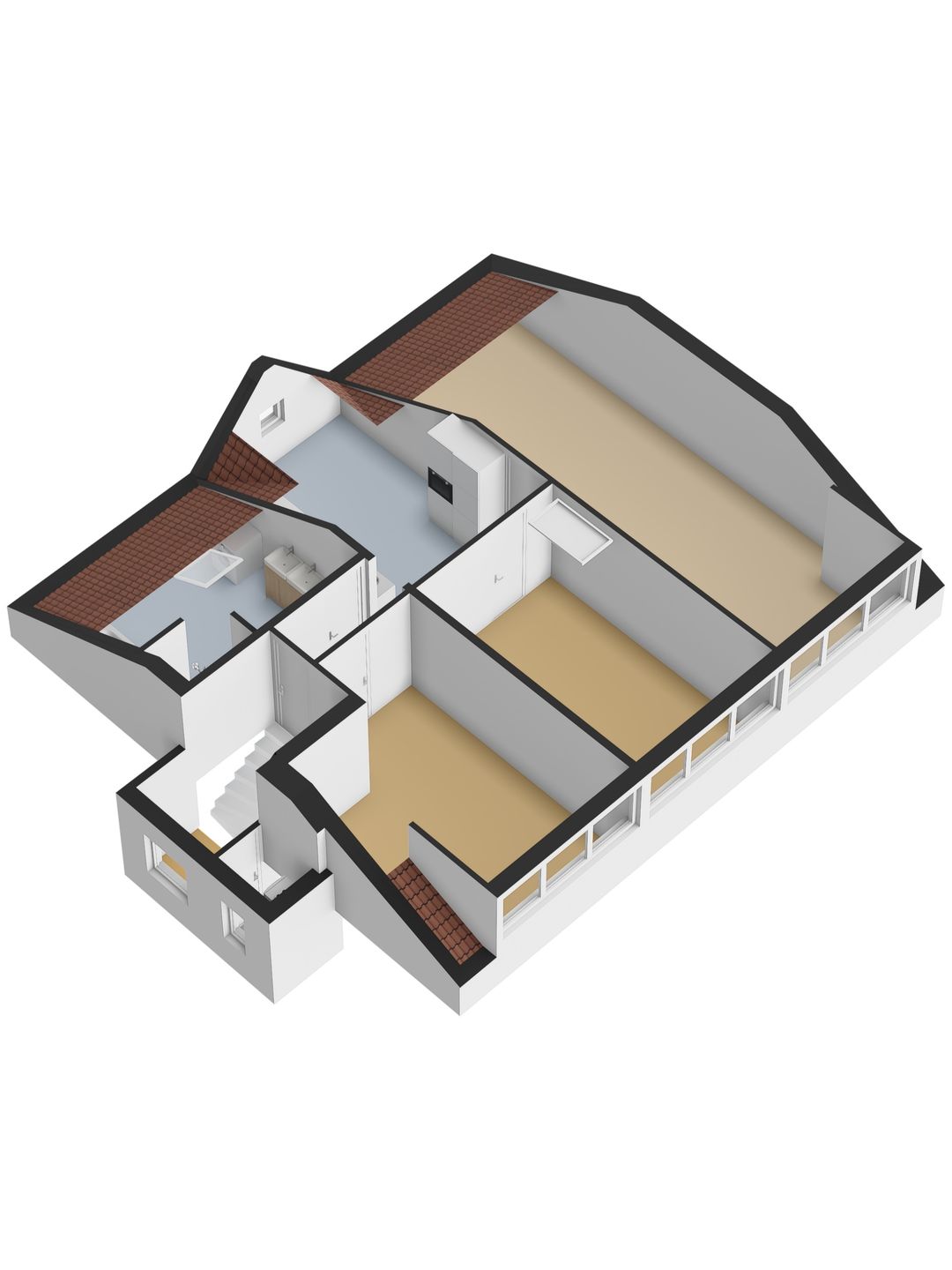 Eerste verdieping: kamer ca. 5,27 x 2,85 m en deels betegelde badkamer ca. 2,86 x 0,93 m met duocloset en douche