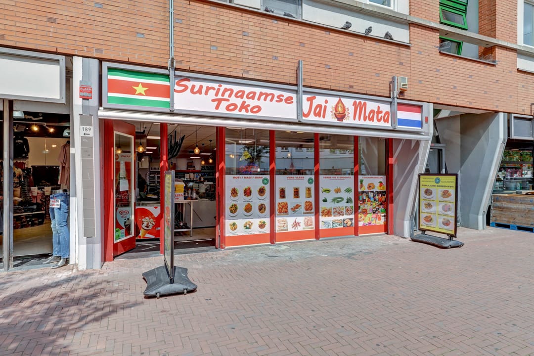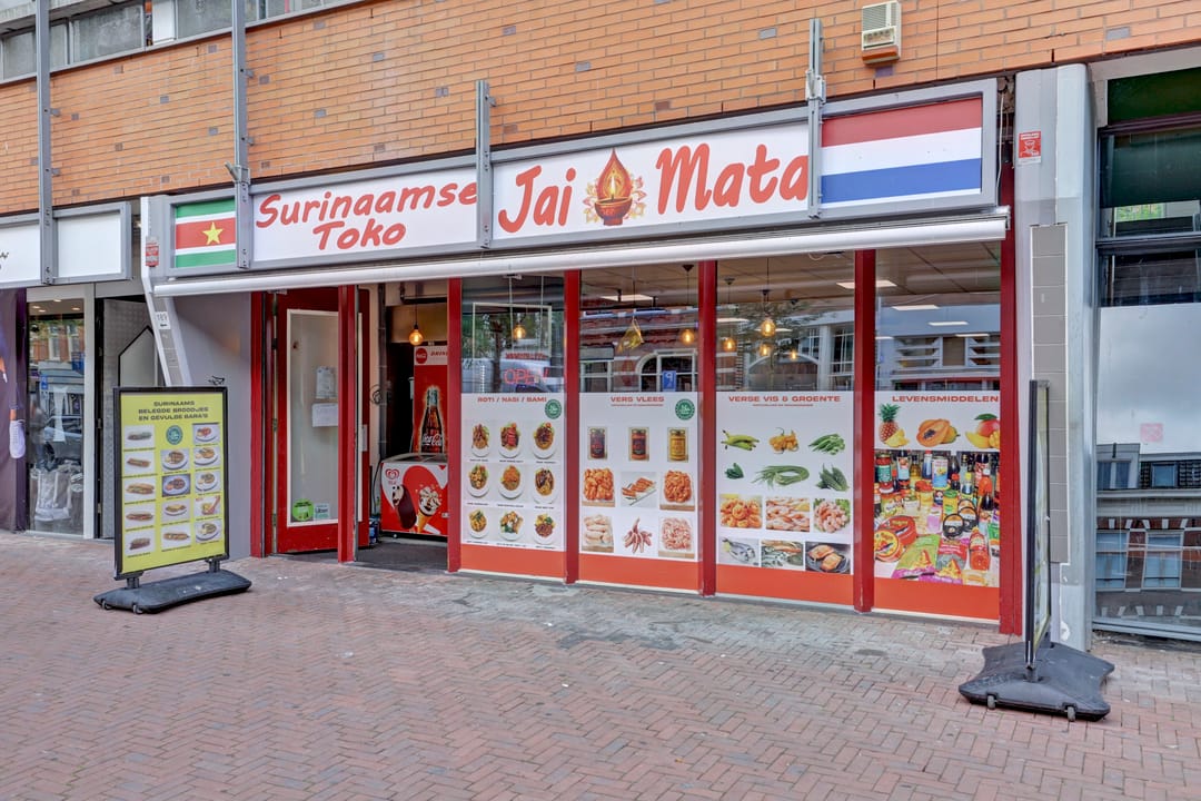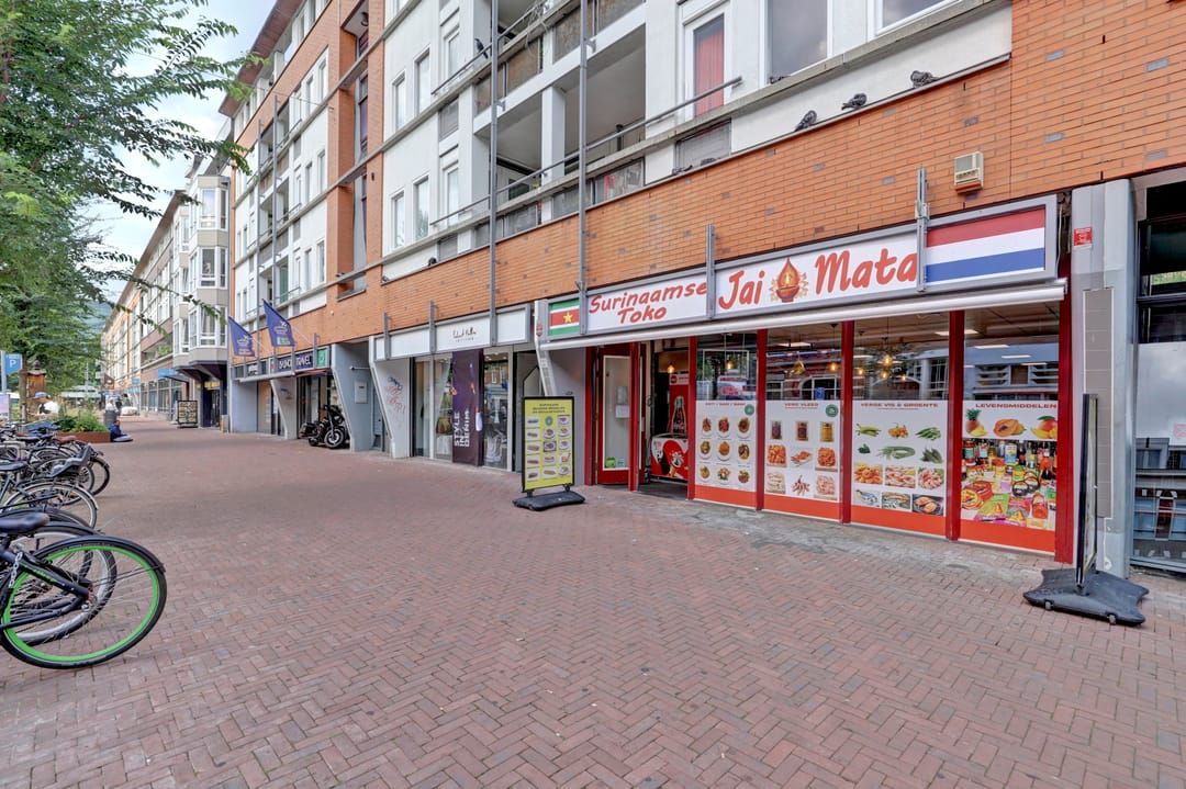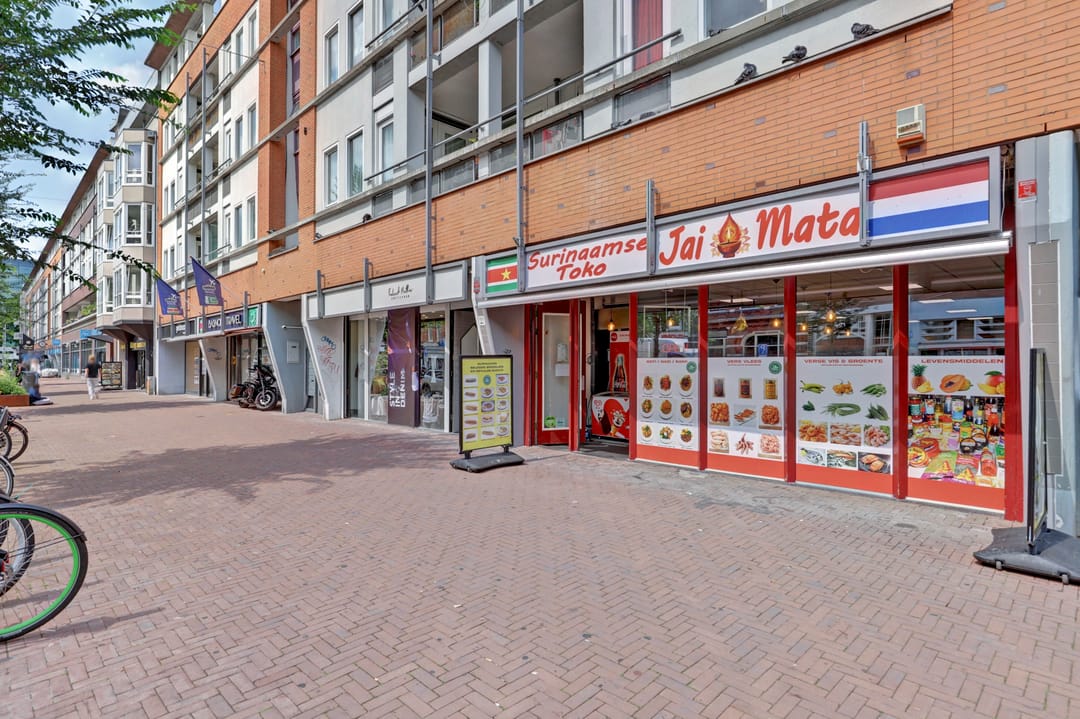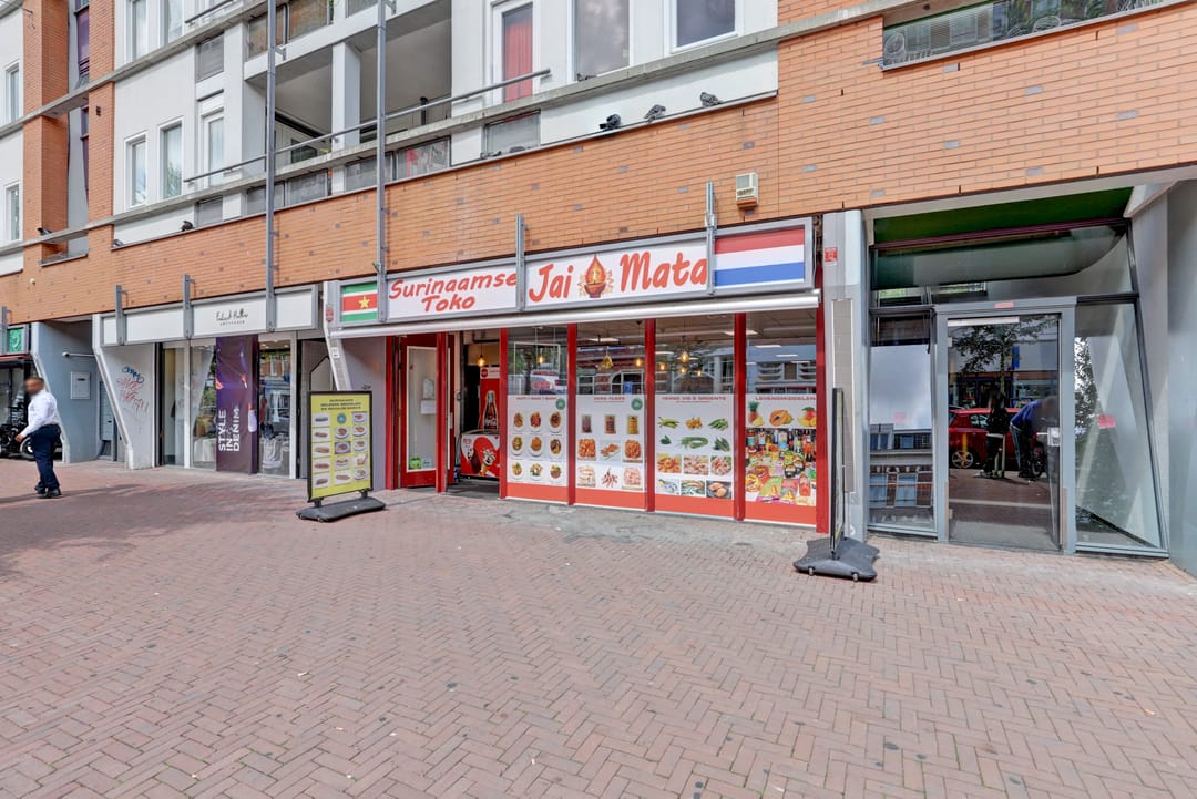 De winkelruimte bevindt zich op de begane grond en heeft een bruto vloeroppervlak van circa 129 m² (circa 104 m² VVO). De indeling is efficiënt en biedt ruimte voor uiteenlopende winkel- of dienstverlenende concepten. De ruimte is netjes afgewerkt en wordt momenteel gebruikt als een Surinaamse toko met een breed assortiment levensmiddelen, snacks en producten. Aan de achterzijde bevinden zich een pantry en een toilet.