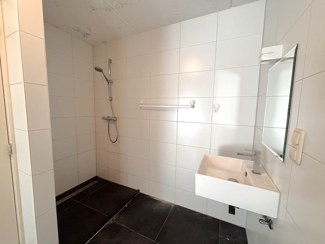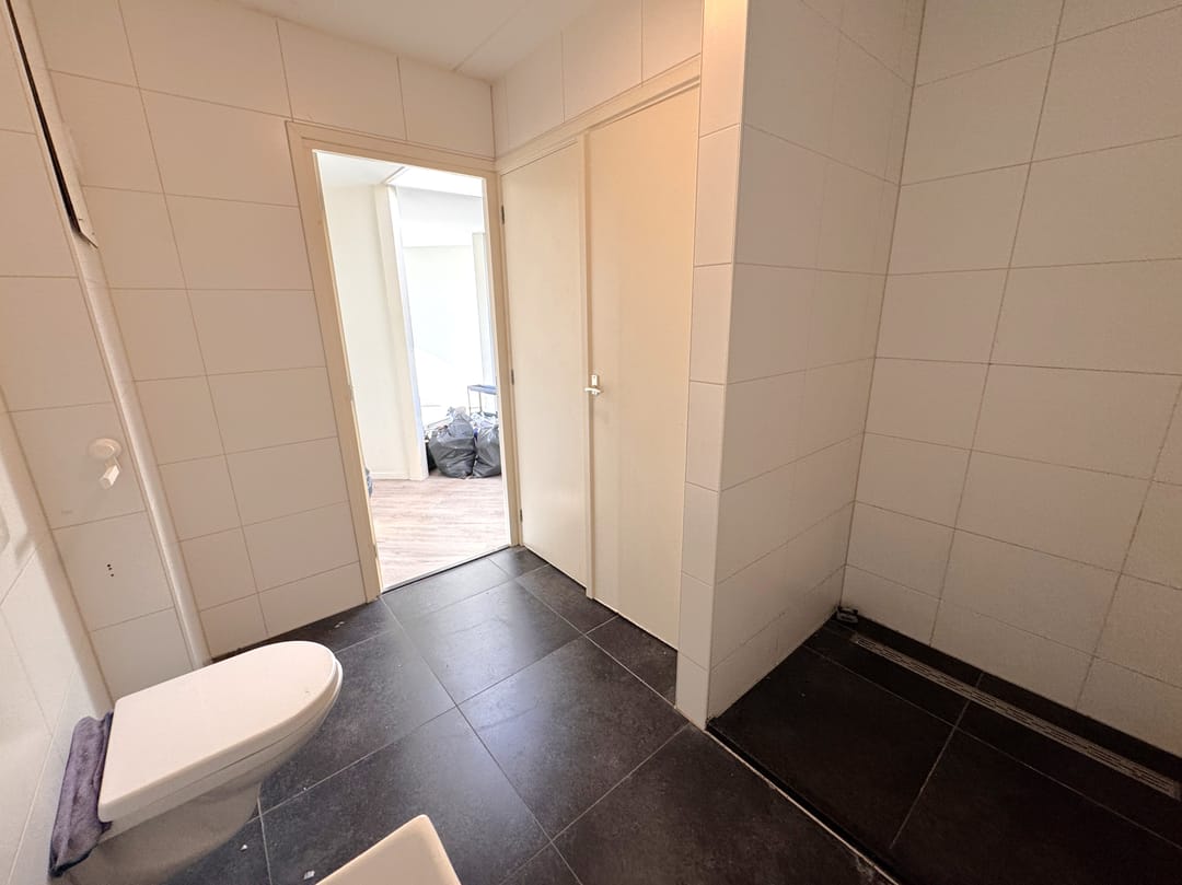 - Badkamer met wandcloset , wastafel, douche en grote kast met daarin de aansluiting wasmachine en droger.