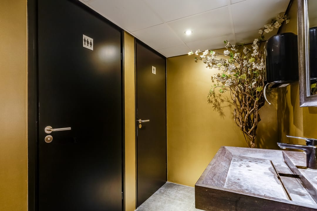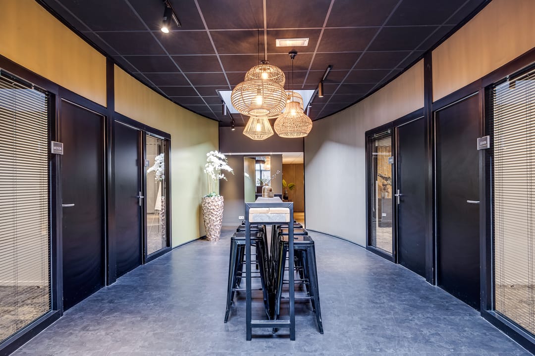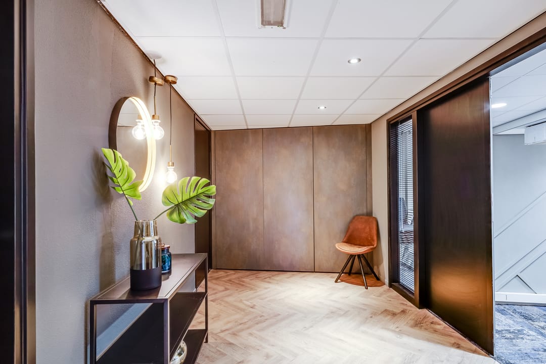 Een belangrijk pluspunt van deze kantoorruimte is het gebruik van de gezamenlijke voorzieningen op de tweede verdieping, inclusief een volledig servicepakket. Deze verdieping is modern en stijlvol ingericht en biedt een representatieve entree met balie, een sfeervolle ontvangstruimte met bar en volledig uitgeruste vergaderruimten. Deze faciliteiten zijn beschikbaar op basis van reservering en dragen bij aan een professionele ontvangst van gasten en relaties. De afwerking van deze verdieping is eigentijds en hoogwaardig, met een combinatie van verschillende vloerafwerkingen, moderne wandbekleding, glazen wanden en een prettige lichtinval.