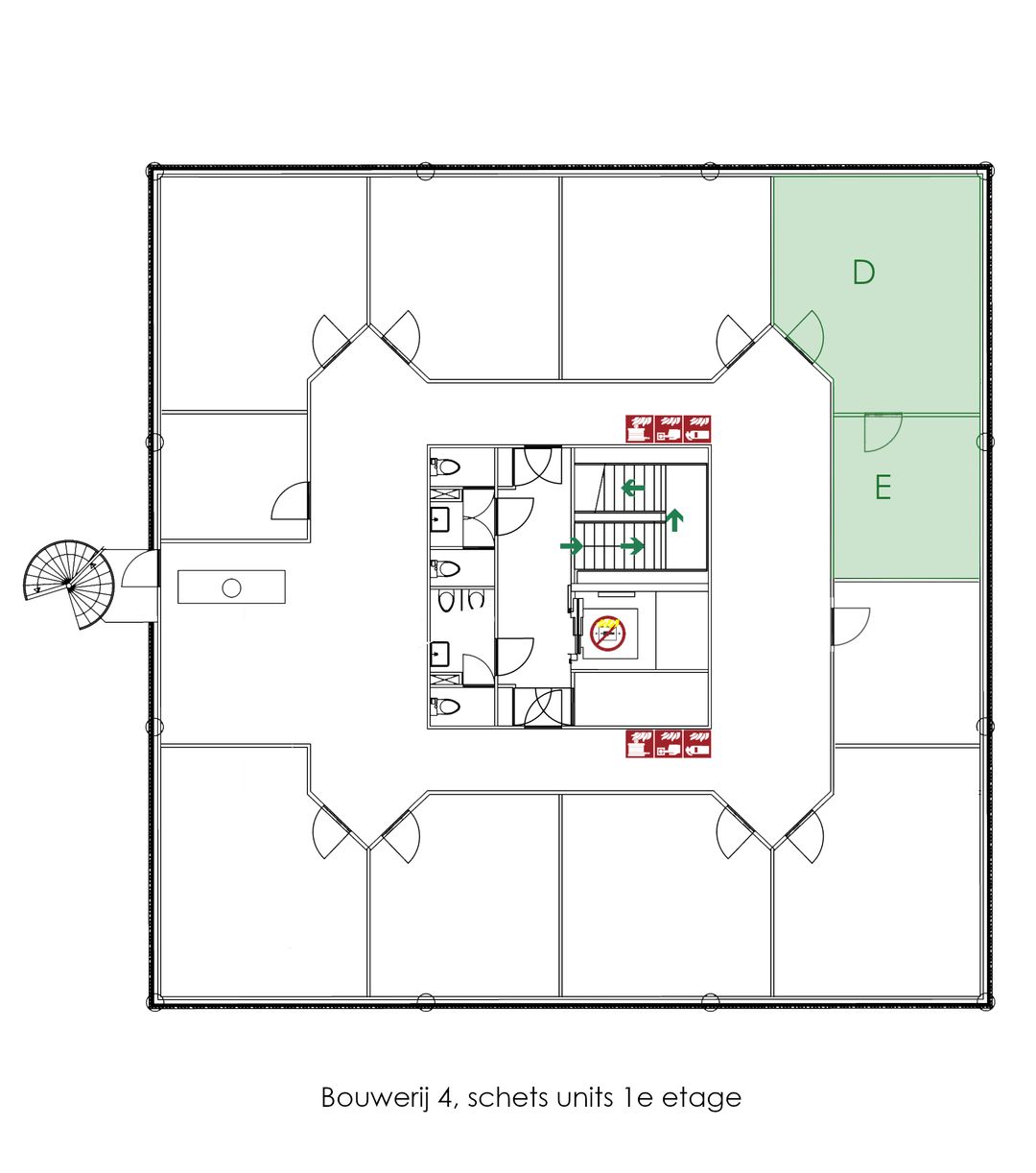 - Unit D + E (geschikt voor circa 2-6 werkplekken) : € 825 per maand;
