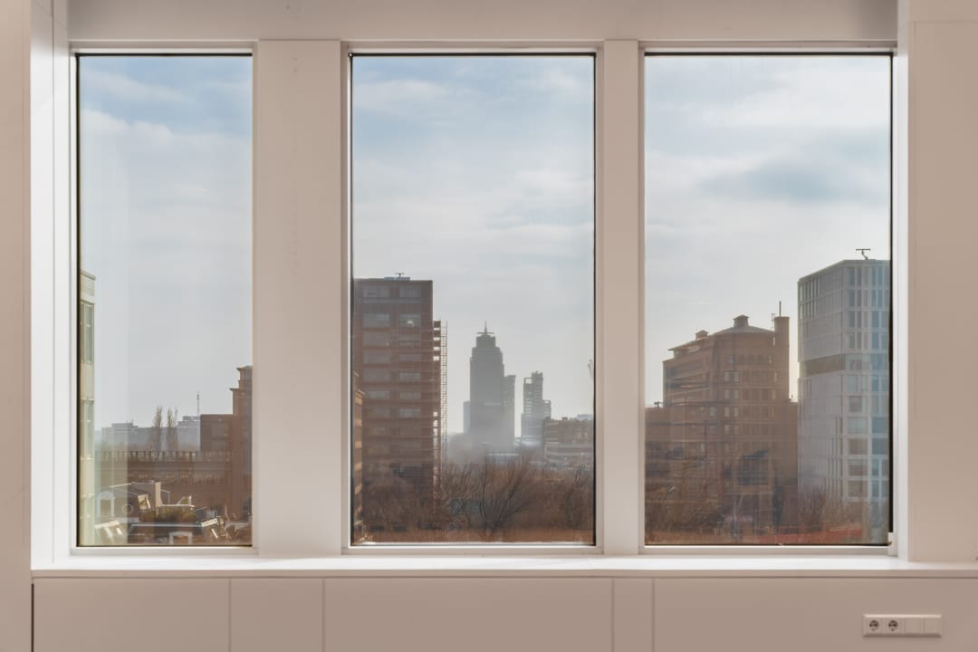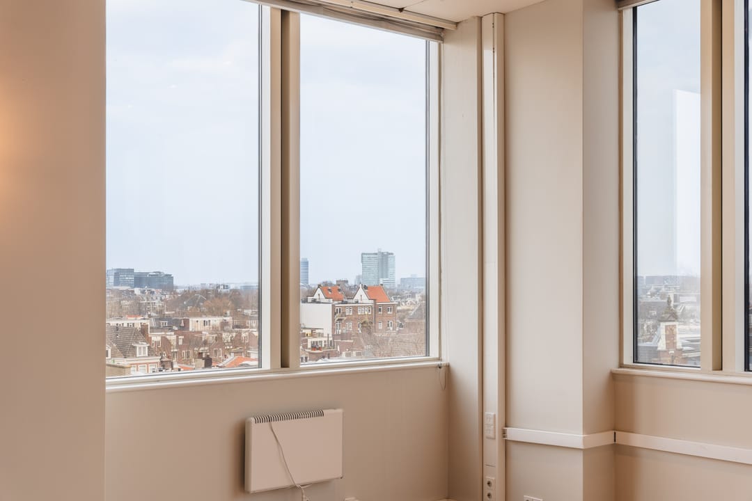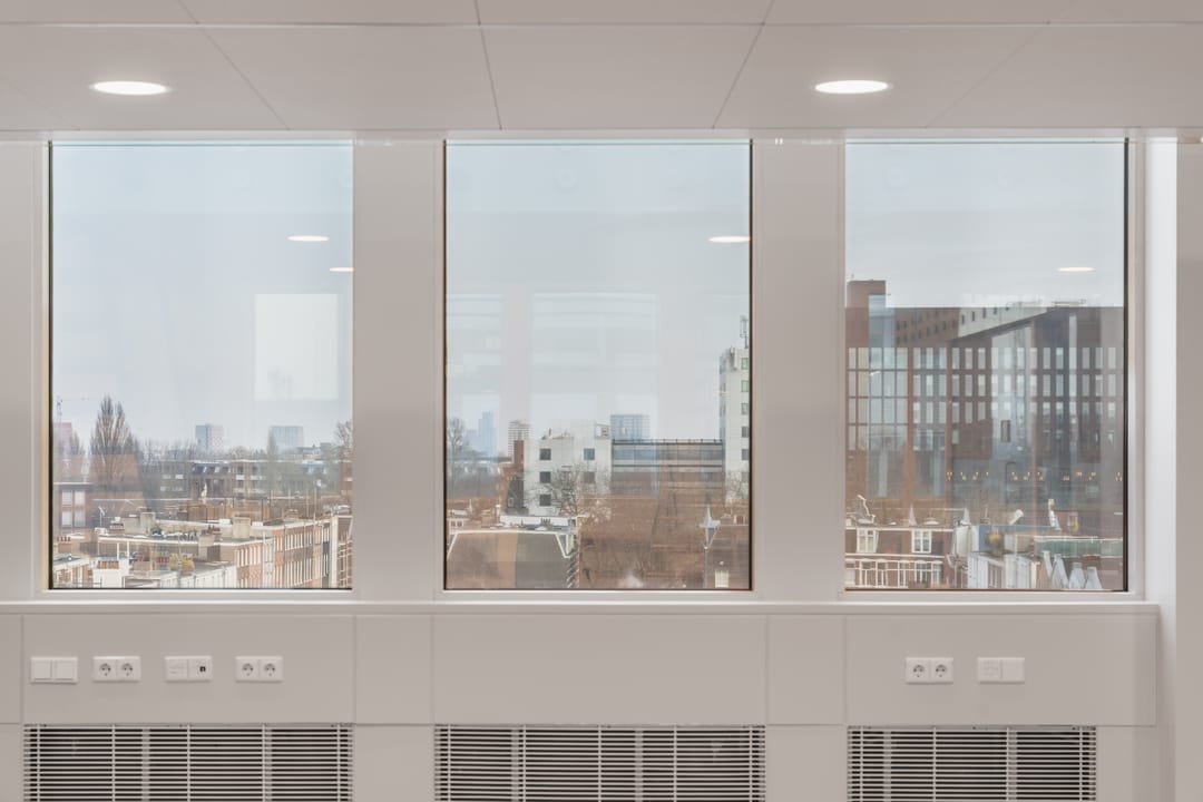 The office floor includes its own restrooms, a pantry, and multiple meeting rooms. Thanks to its location on the top floor, the high ceilings, and windows surrounding the entire space, the floor offers an exceptional amount of natural daylight and impressive panoramic views over Amsterdam — from the Zuidas business district all the way to Amsterdam Central Station.