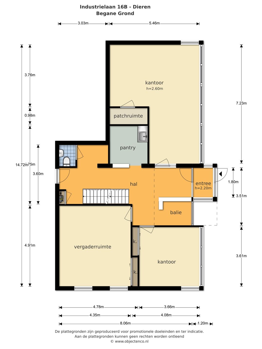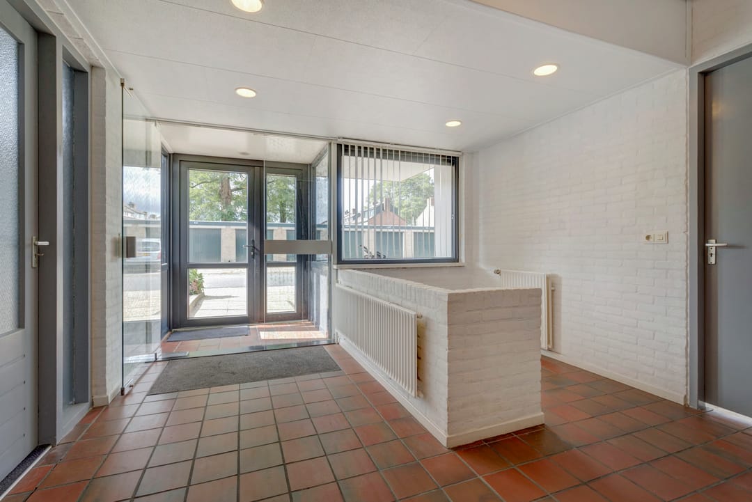 Begane grond: vestibule, entree met ontvangstruimte/balie, hal met garderobenis, pantry, toiletruimte en trapopgang naar de verdieping en kelder.