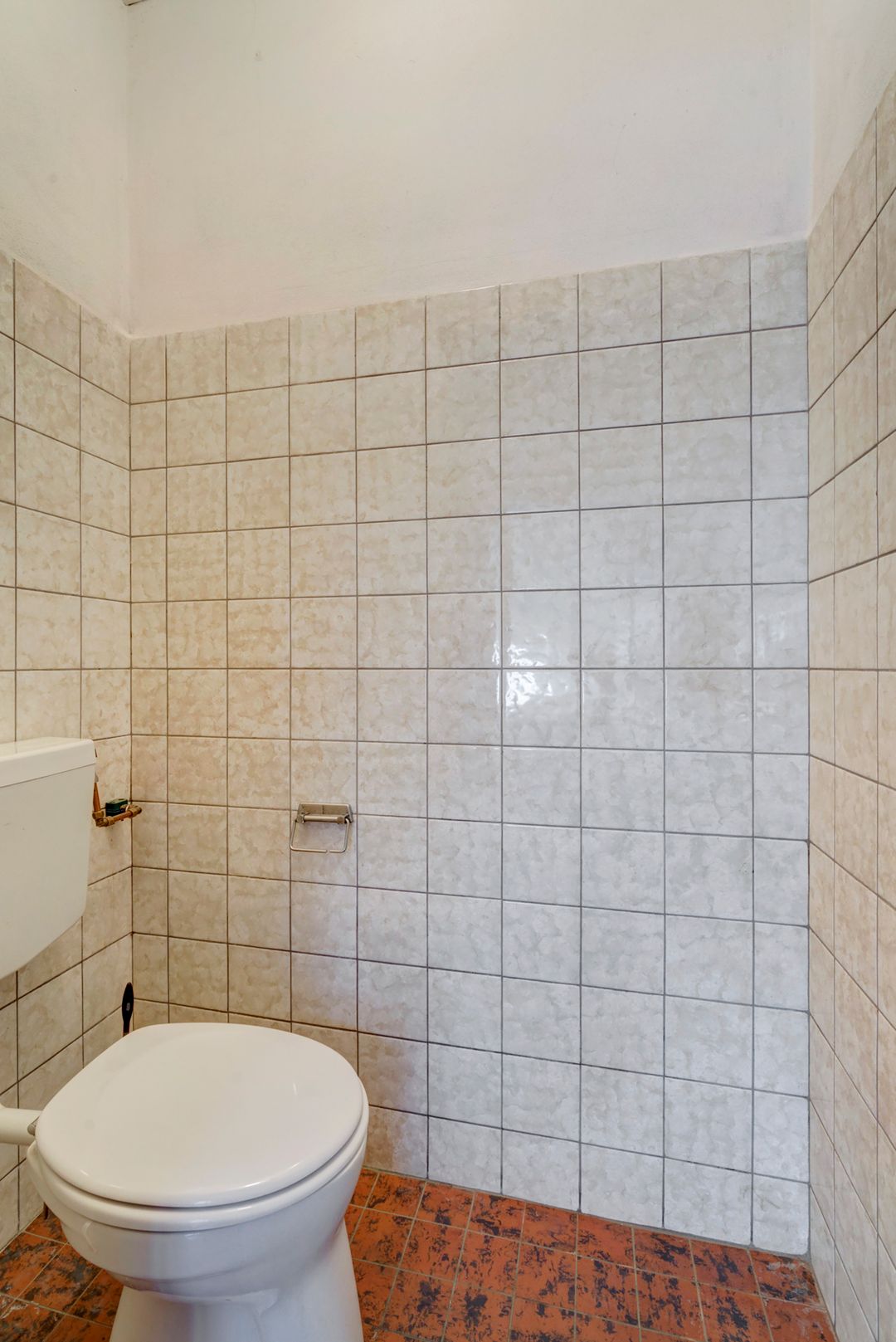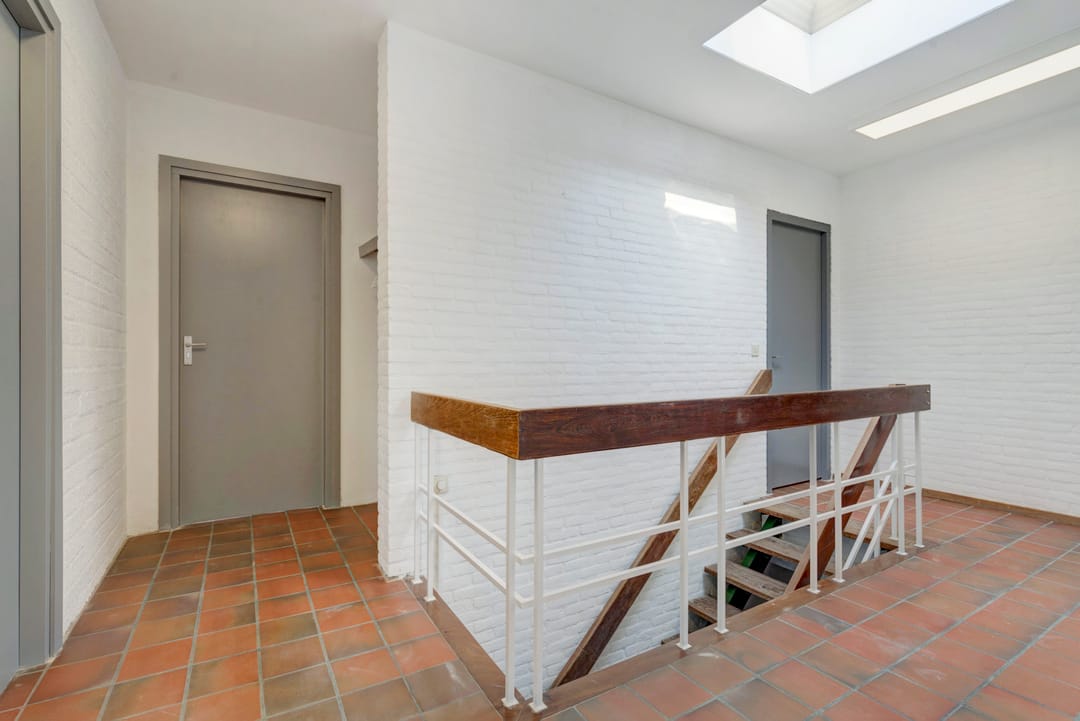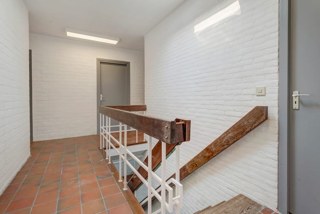 Verdieping: overloop met garderobenis, toiletruimte en nooduitgang.