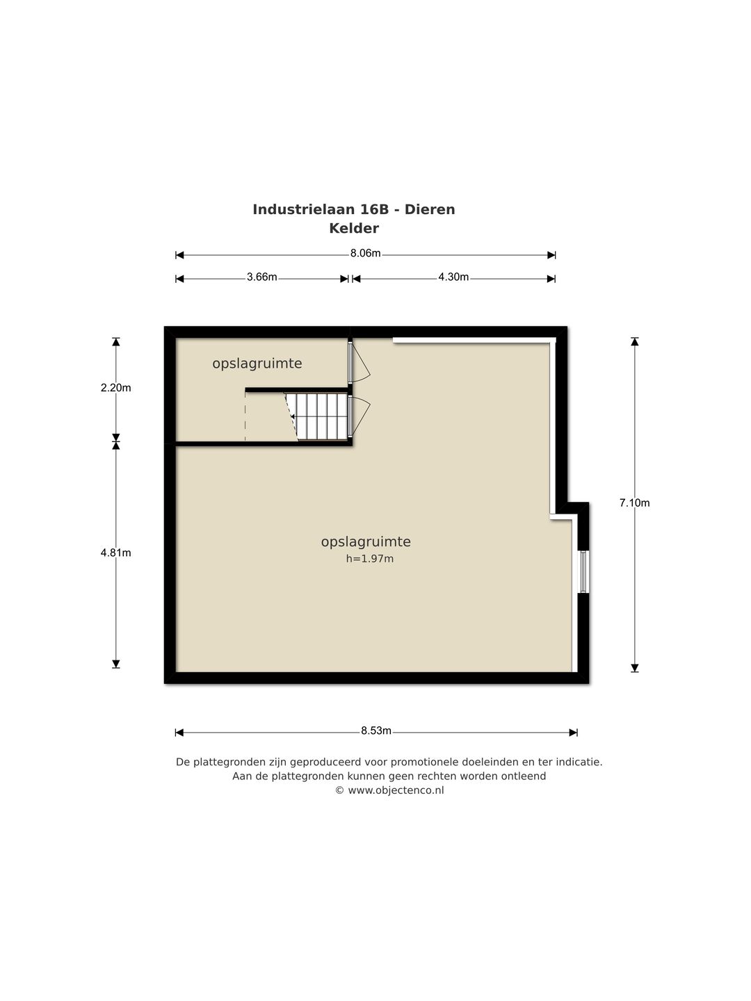 Kelder: verwarmde opslagruimte van circa 60 m² met een stahoogte van circa 1,96 m, voorzien van stellages.