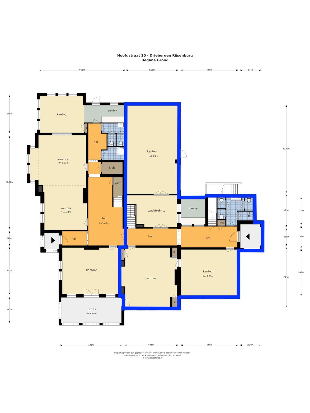 Kantoorpand met entree, diverse kantoorruimtes, vergaderruimte, kelder, pantry’s en toiletten.