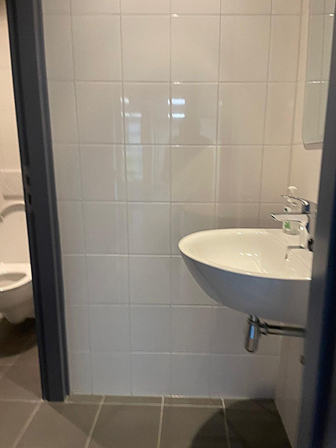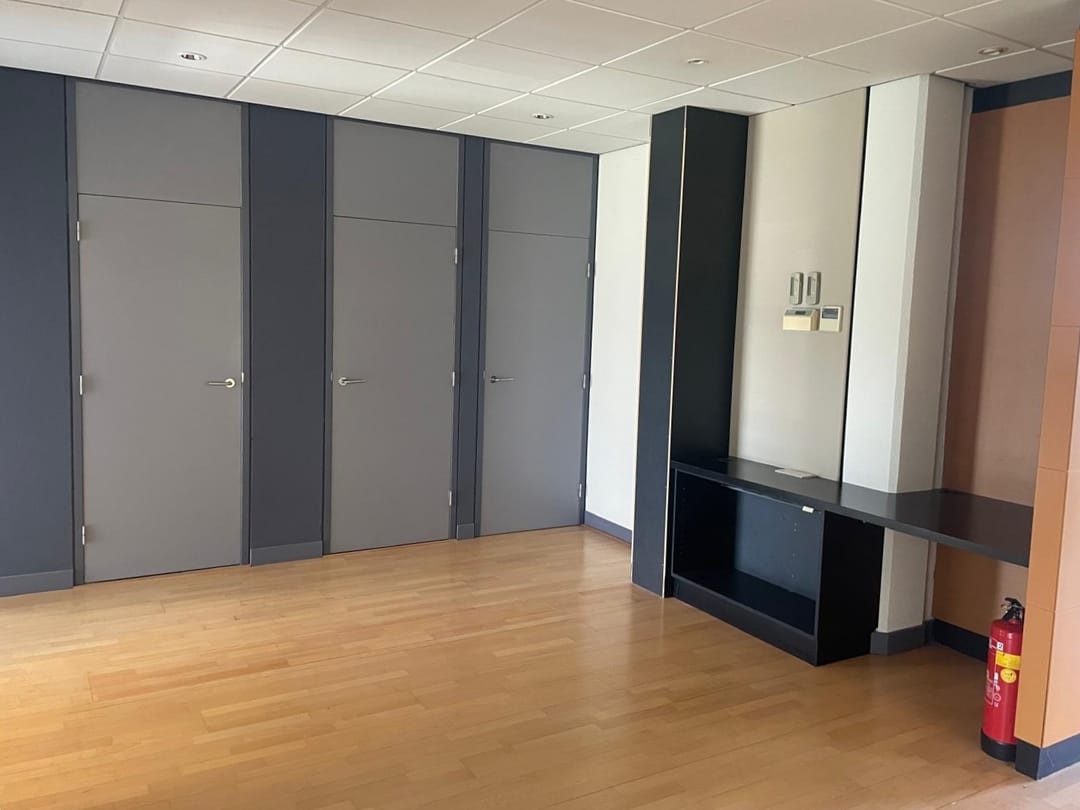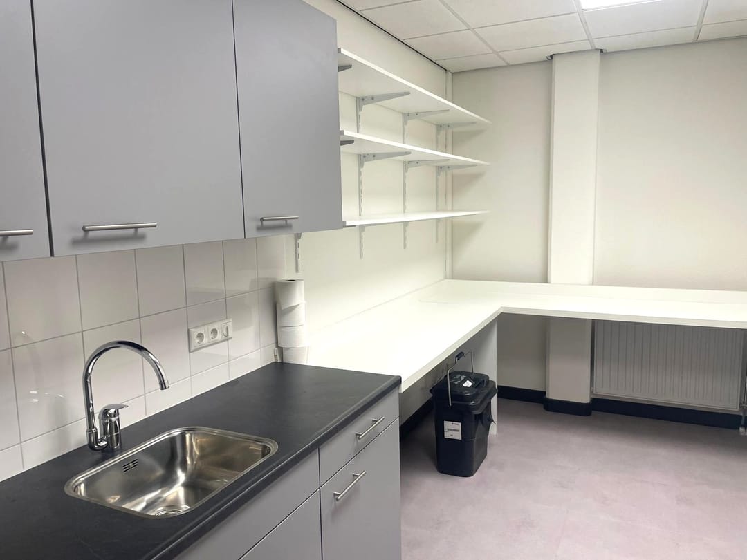 Ruime hal met open werkruimte (40 m²), toiletgroep (5 m²) met voorportaal en dames- en herentoilet, 4 kantoren (36, 27, 27 en 14 m²) en de ingerichte keuken ( 10 m²).