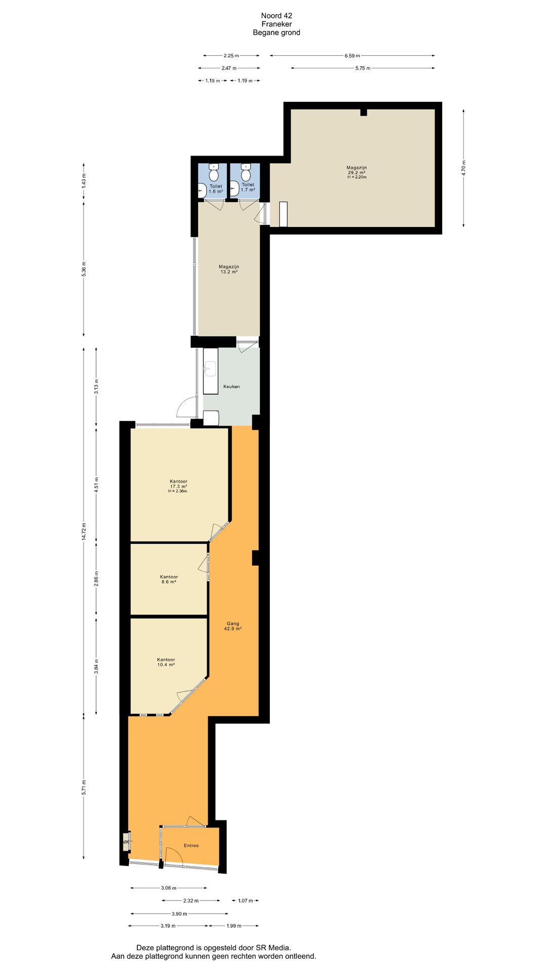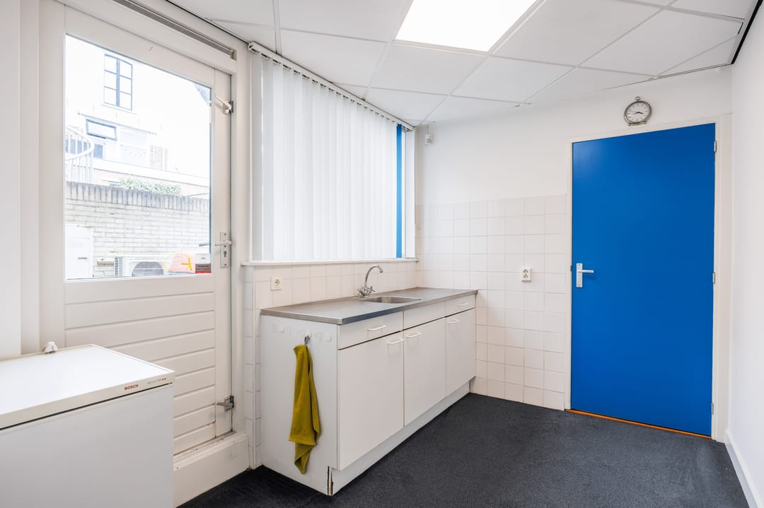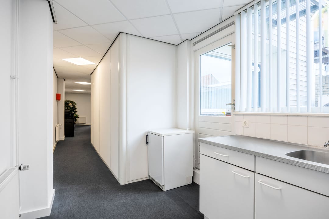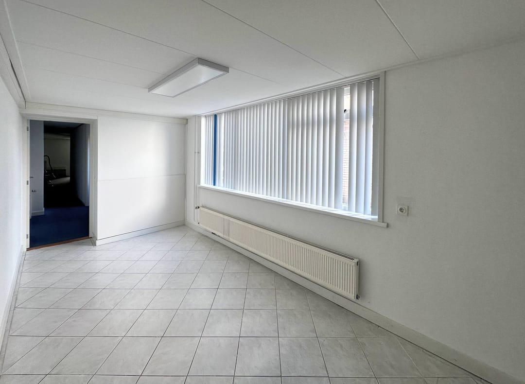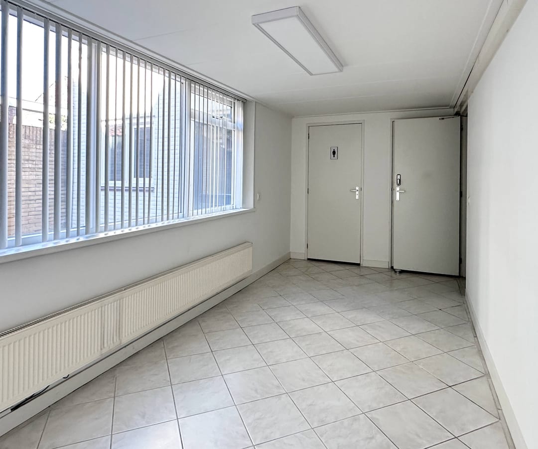 B.g.: entree, vestibule, ontvangstruimte met balie, en aangrenzende kantoorruimte 1 (ca. 10½ m²), kantoorruimte 2 (ca. 8½ m²) en kantoorruimte 3 (ca. 17 m²); daarachter is de keuken met een deur naar een kleine binnenplaats. Aangrenzend zijn een multifunctionele ruimte/ kantine van ca. 13 m², een tweetal toiletten en magazijn annex technische ruimte (ca. 29 m²).