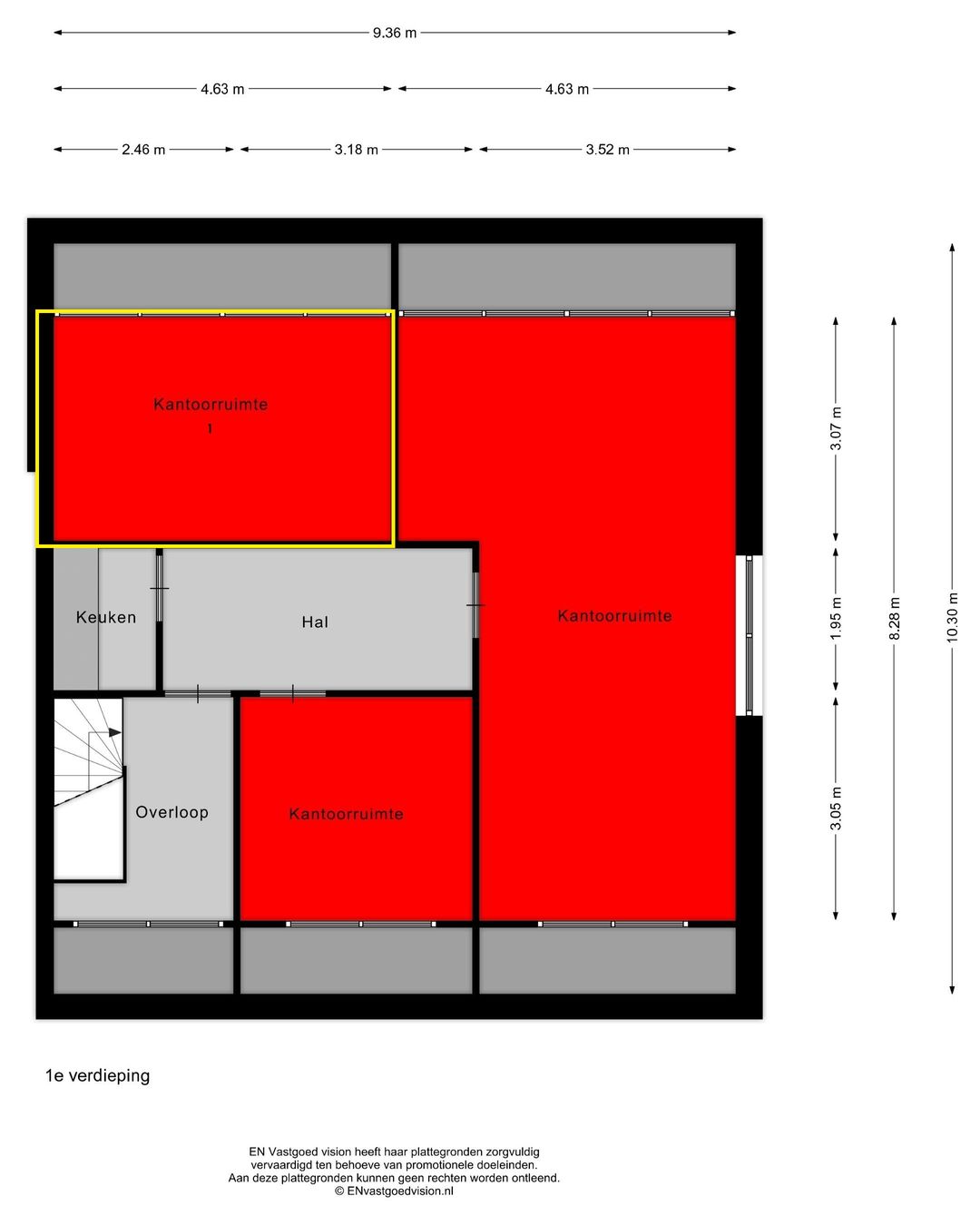 Entree via de voordeur op de begane grond waar de toilet is gelegen. Middels de trap bereikt u de verdieping waar deze kantoorruimte is gelegen. Op de eerste verdieping bevindt zich een gedeelde pantry.