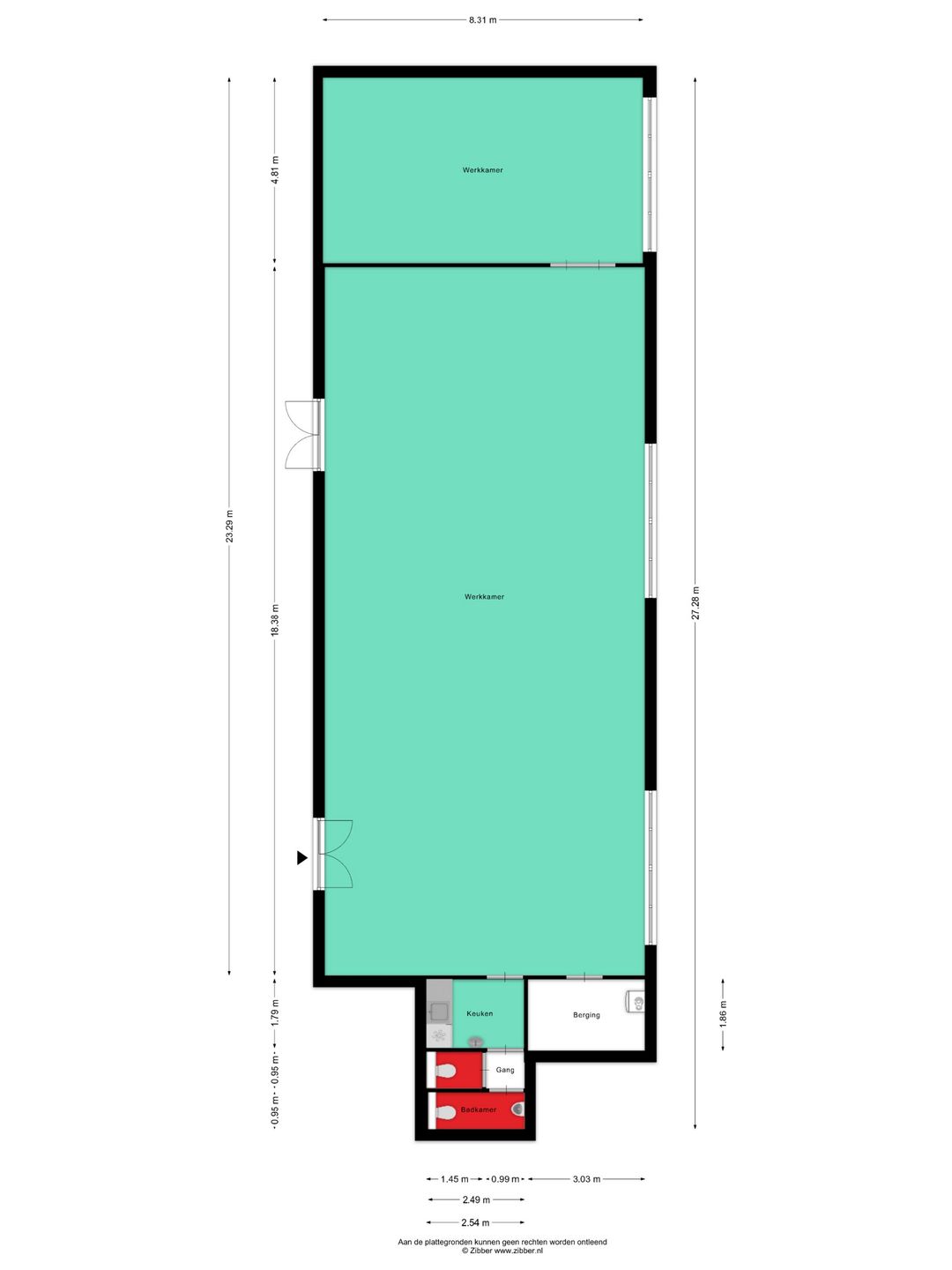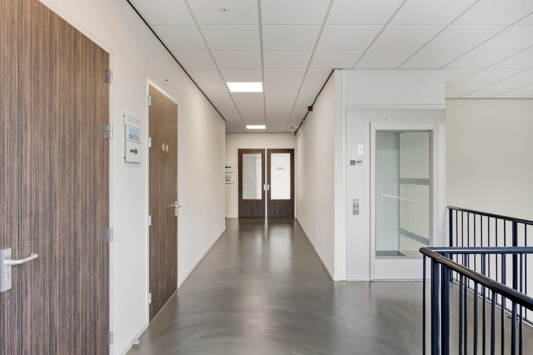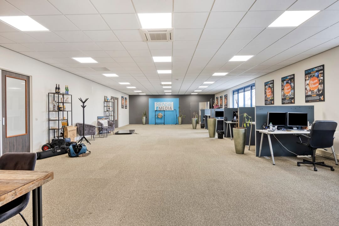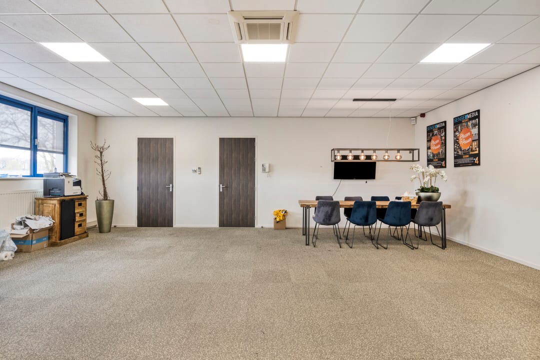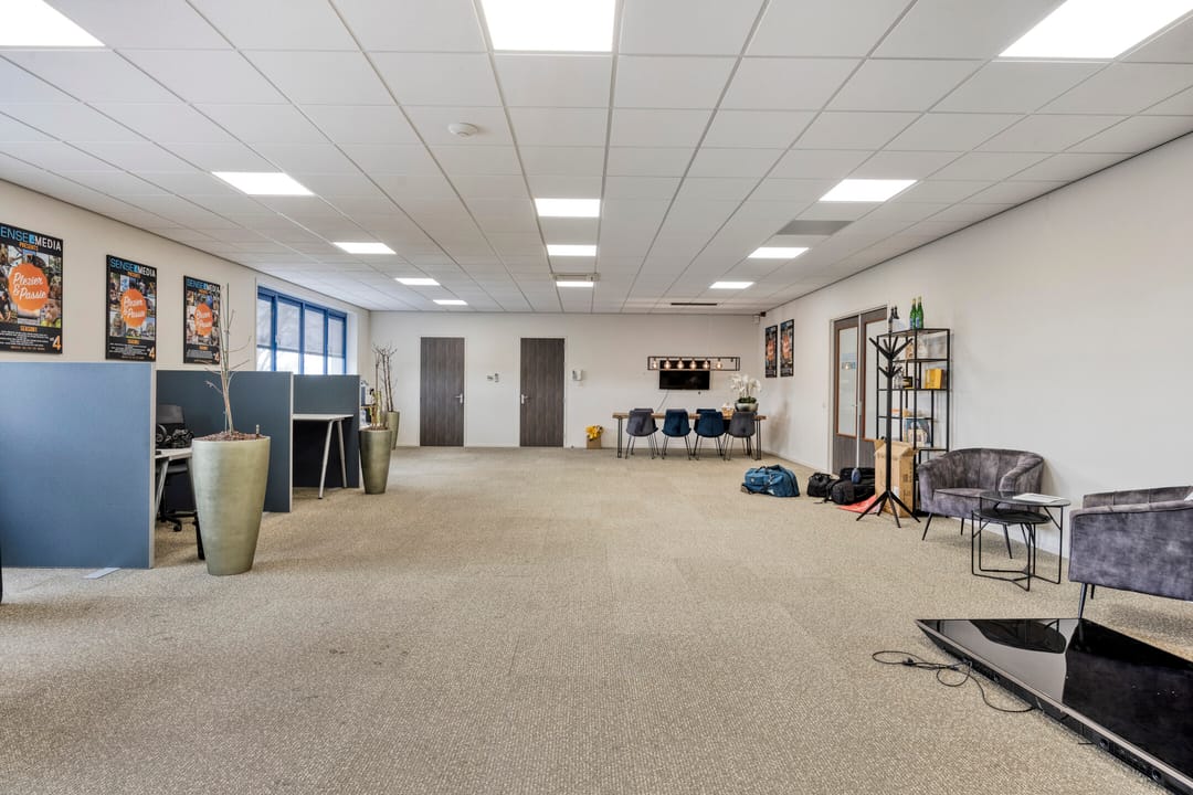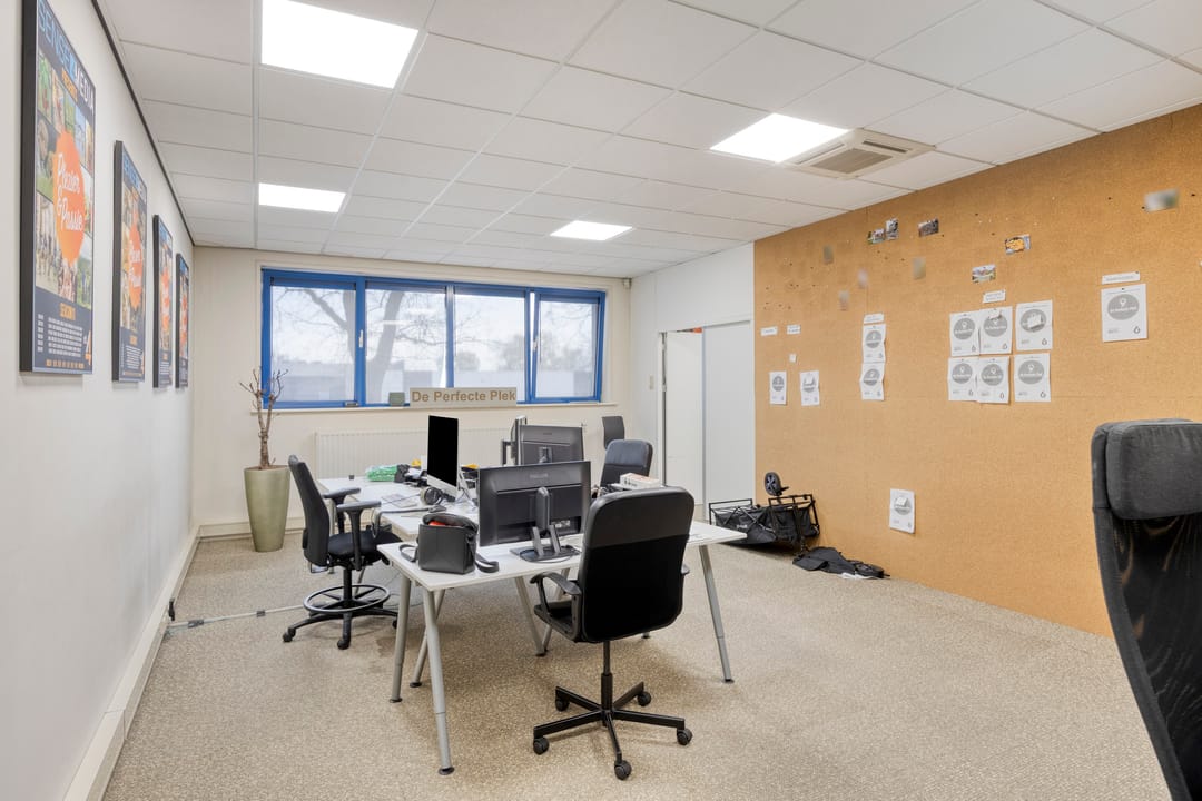 De kantoorruimte kenmerkt zich door een functionele en flexibele opzet. De open werkruimte kan desgewenst eenvoudig worden ingedeeld met (mobiele) scheidingswanden, waardoor zowel kantoortuinen als separate werk- of vergaderruimtes gerealiseerd kunnen worden. Grote raampartijen en hoge gevelvensters zorgen voor een uitstekende daglichttoetreding, wat bijdraagt aan een prettige werksfeer.