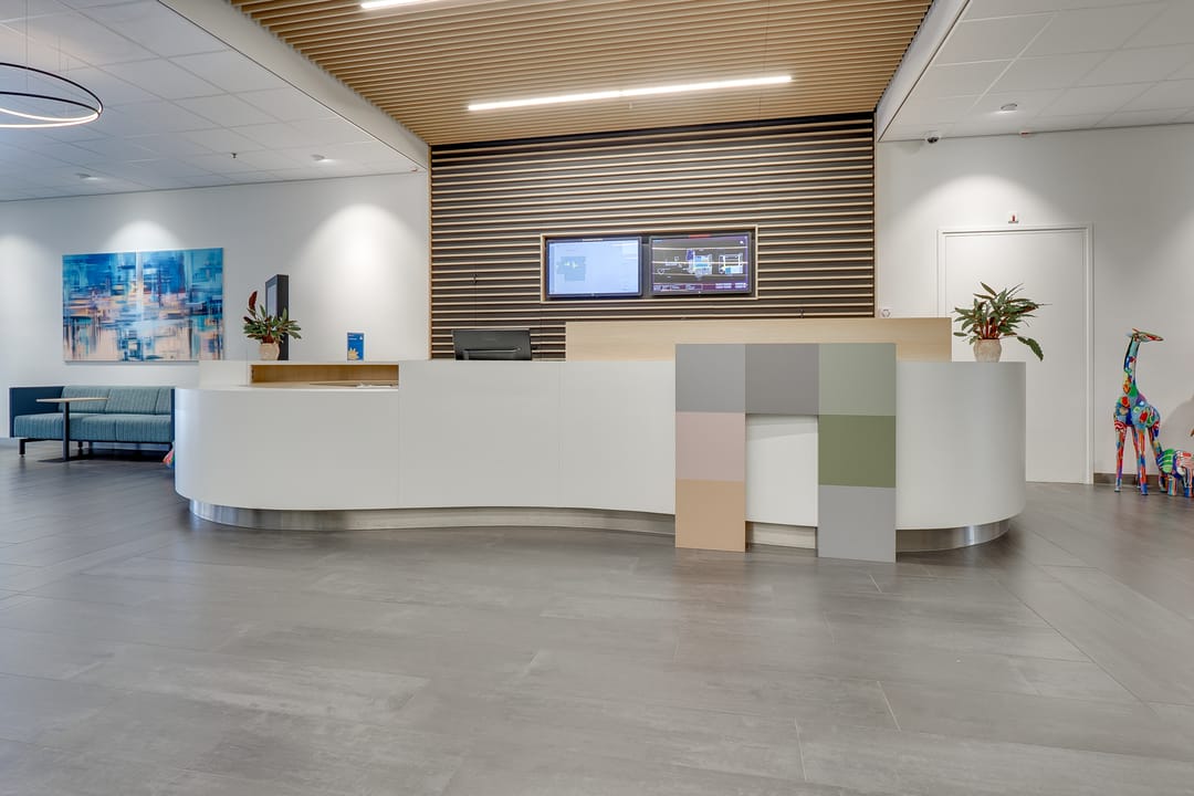 - Centrale entreehal met royale ontvangstbalie en bemande receptie alsmede wachtruimte met zitplaatsen;