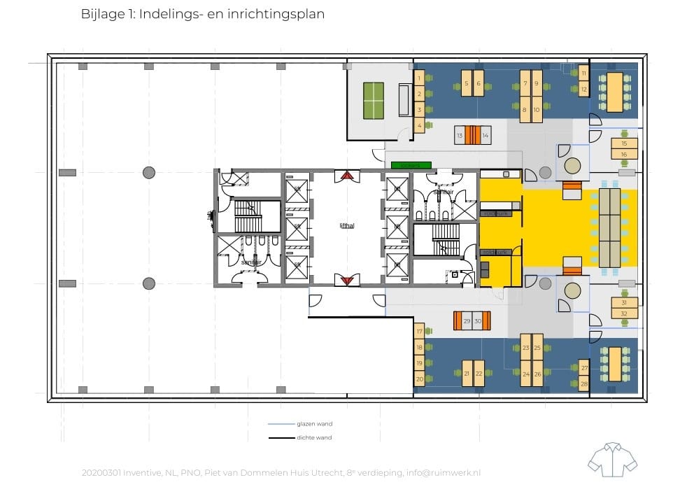 De kantoorruimte zal (schoon en ontruimd) worden aangeboden in de huidige staat voorzien van onder andere de volgende voorzieningen;