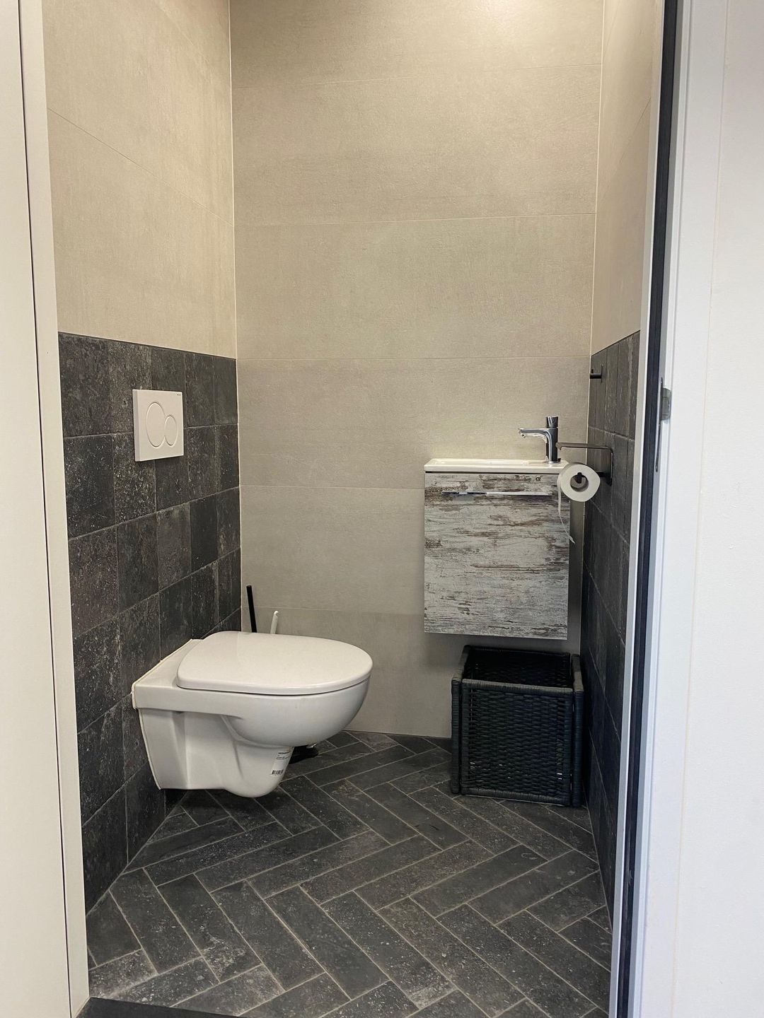 Deels betegeld toilet voorzien van hangcloset.