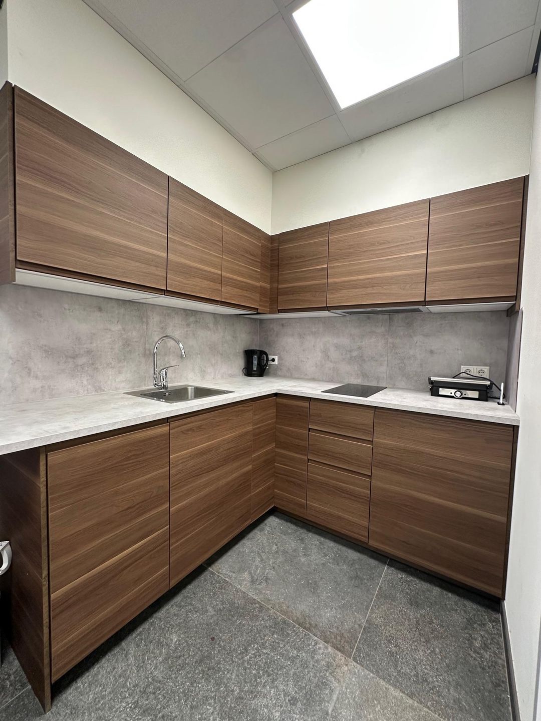 Keukenblok in hoekopstelling met wasbak, inductie kookplaat voorzien van afzuigkap, vaatwasser en koelkast met vriesvak.