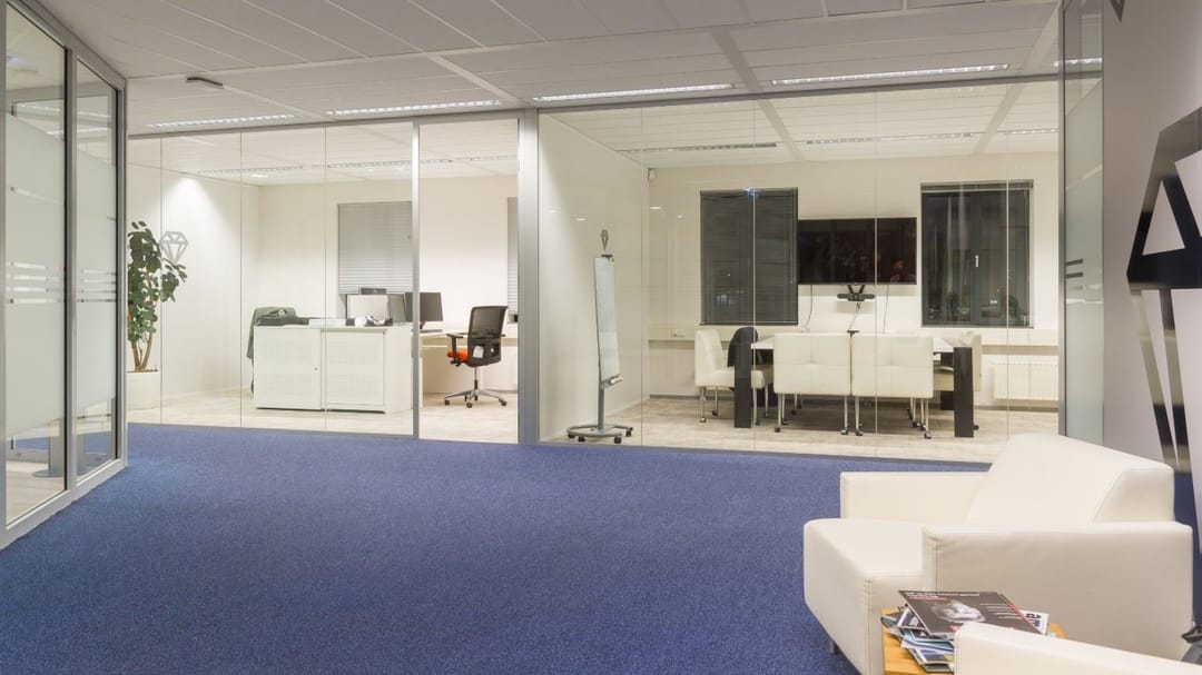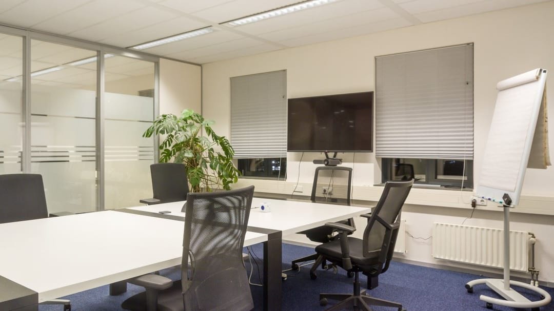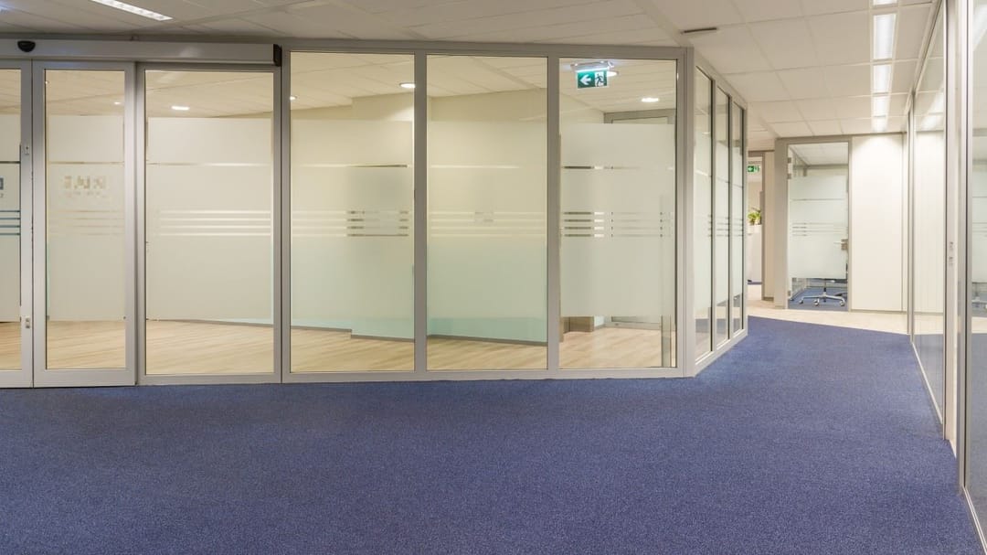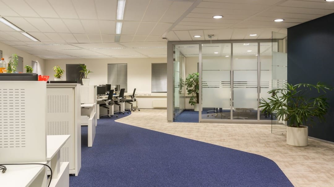* bestaand kantoorinbouwpakket voorzien van (systeem)scheidingswanden, vloerafwerking, binnen zonwering, databekabeling, pantry's etc.