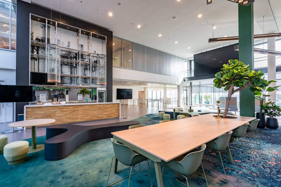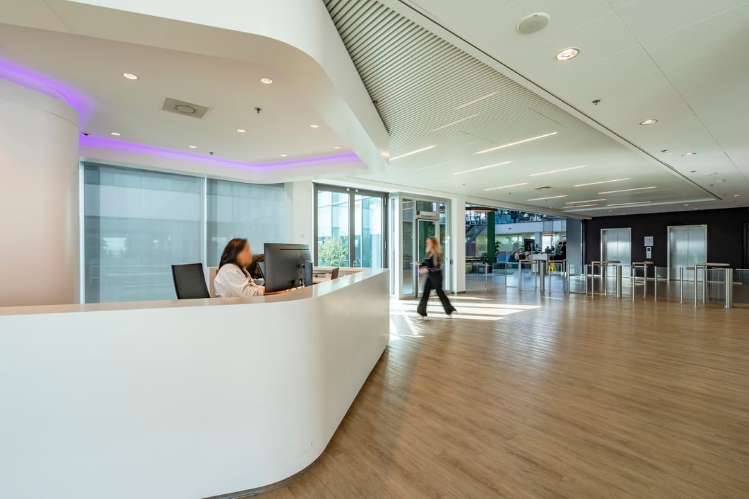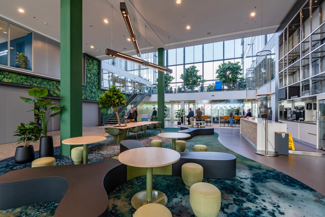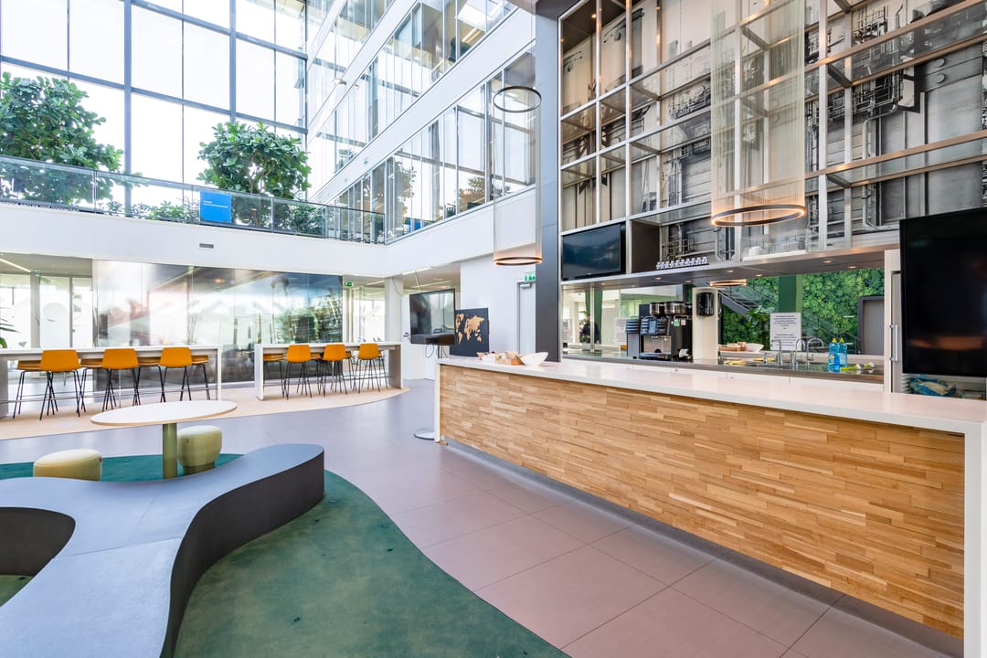 Upon entering, you enter a representative entrance hall with manned reception desk and coffee corner. The atrium provides