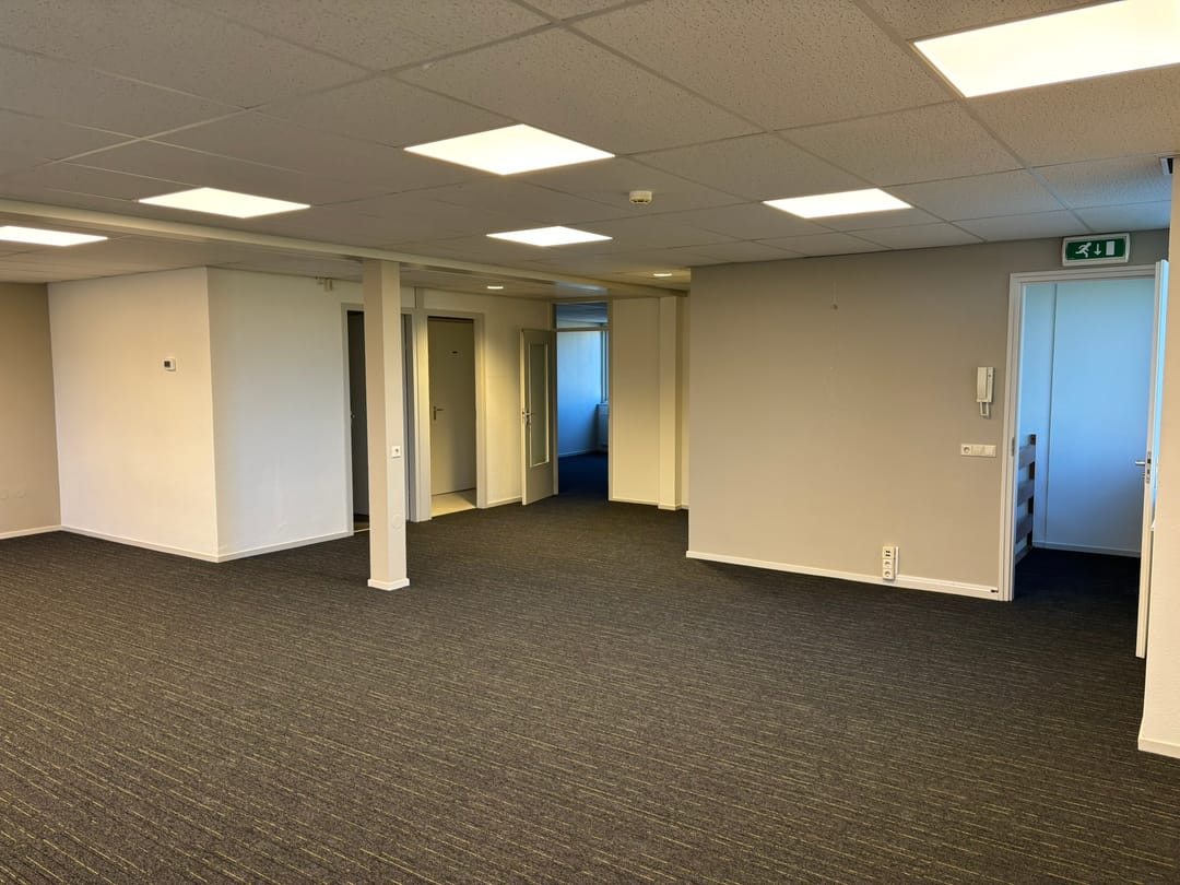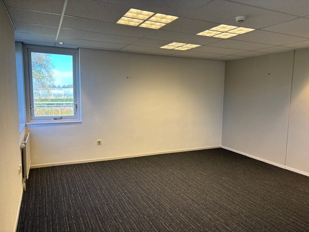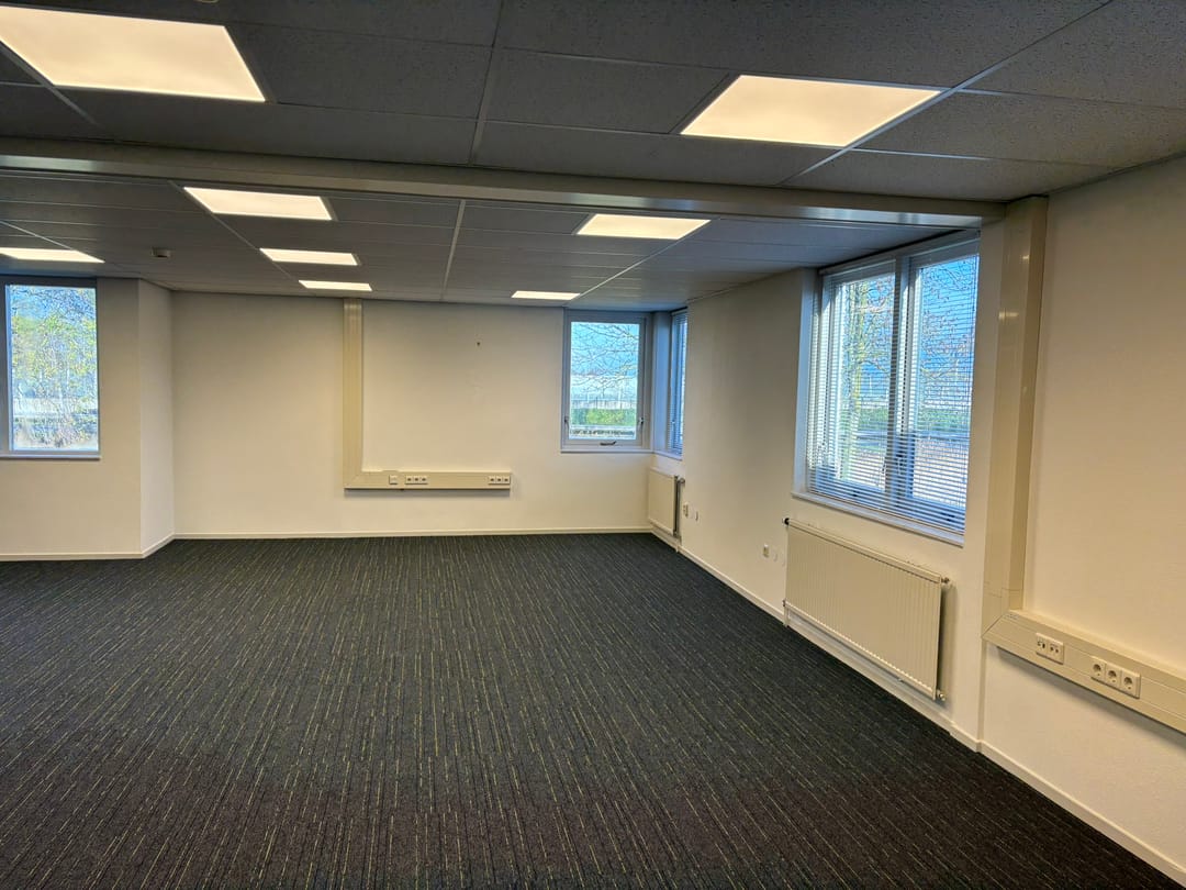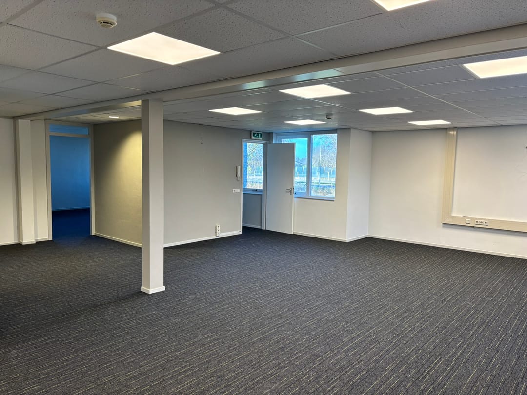 140 m2 moderne kantoorruimte met dubbele toiletgroep, kitchenette, systeemplafond, verlichtingarmaturen en eigen c.v. installatie.