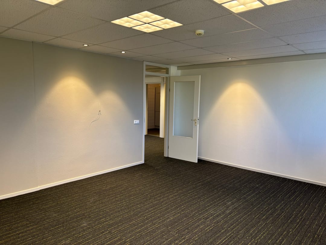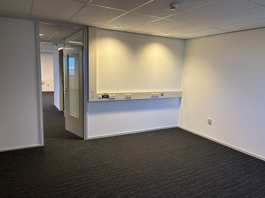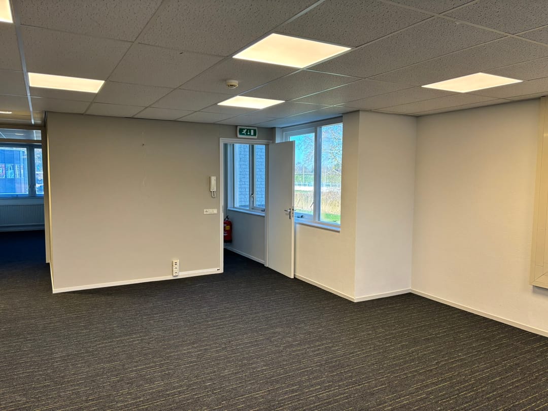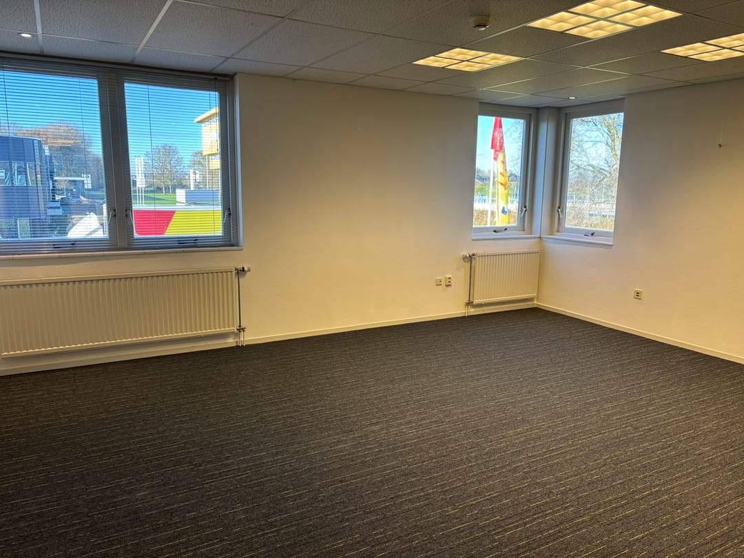 140 m2 moderne kantoorruimte met dubbele toiletgroep, kitchenette, systeemplafond, verlichtingarmaturen en eigen c.v. installatie.