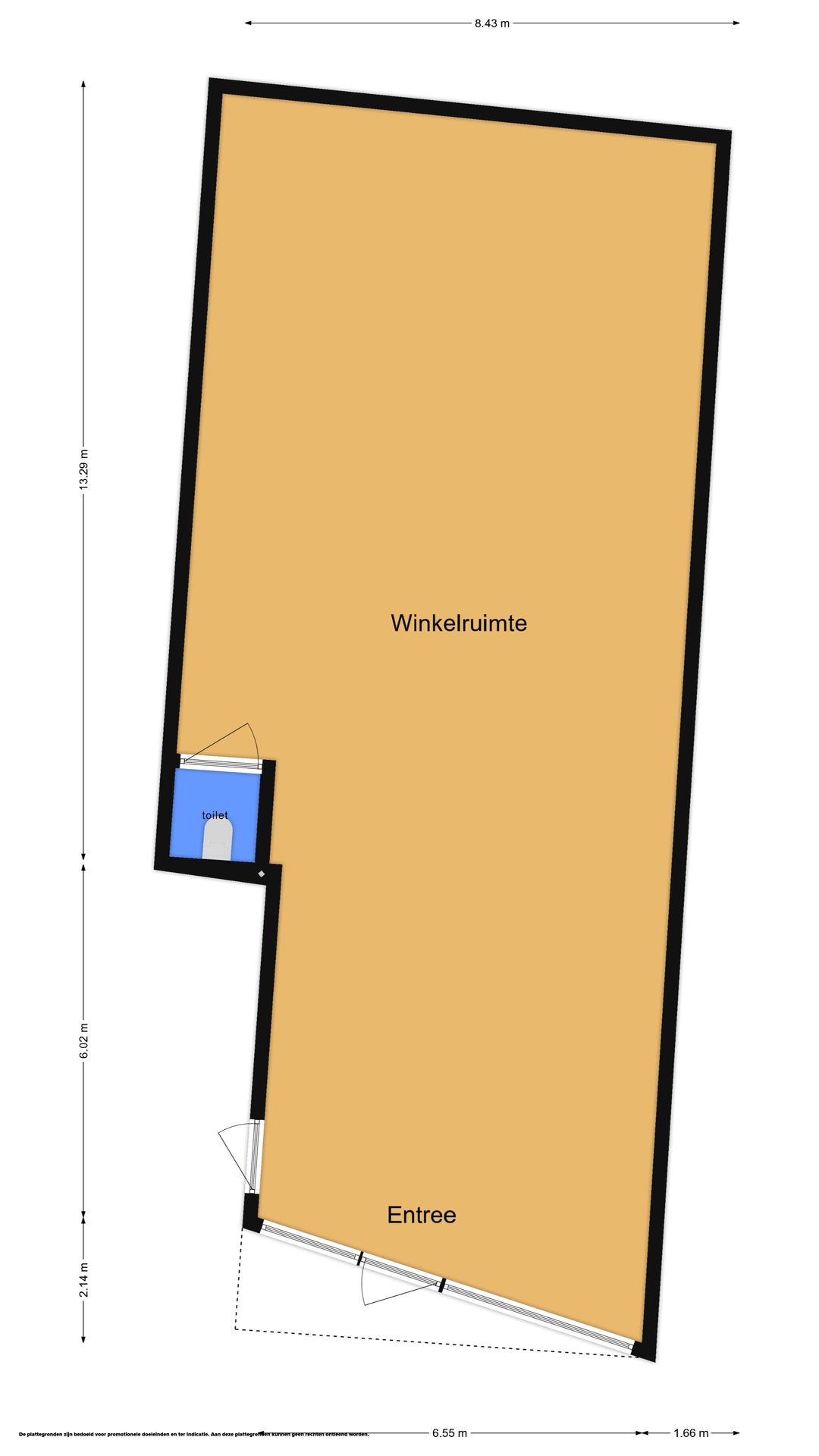 Aan de voorzijde ligt de entree met direct daarachter de open winkelruimte. Halverwege zit een toilet, de rest van het pand is vrij indeelbaar.