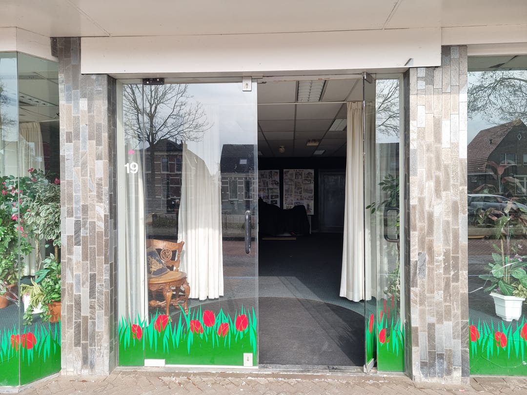 Begane grond: Entree via 2 glazen openslaande deuren kom je binnen in de bedrijfsruimte met toegang naar een eenvoudige kantine en een toilet met closet en fonteintje.