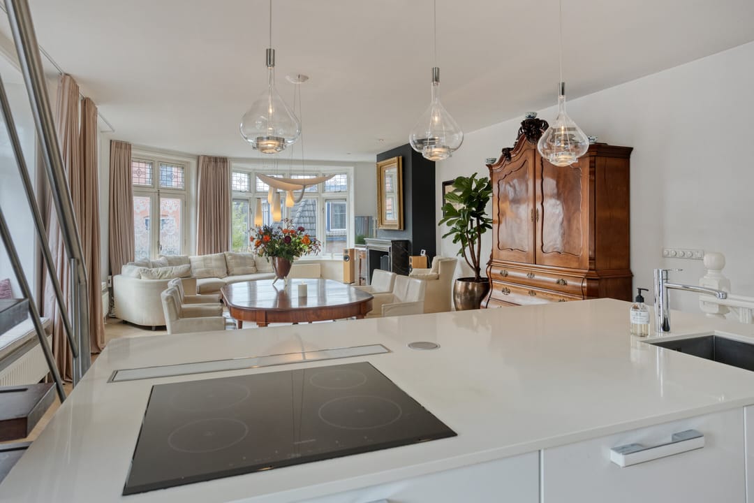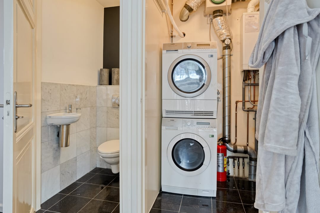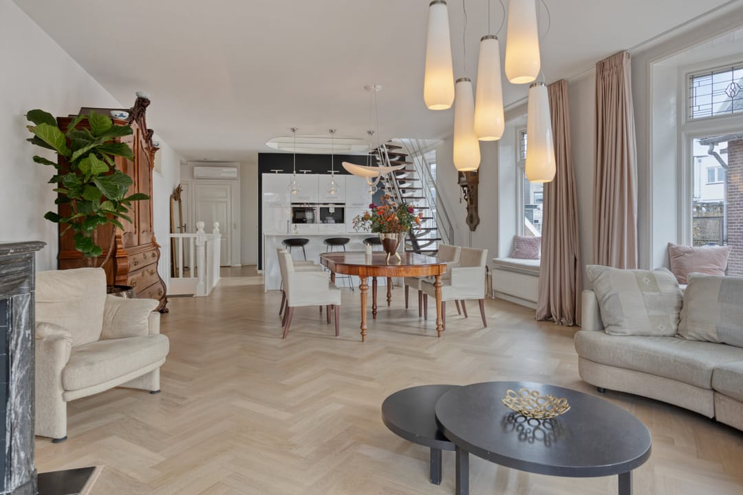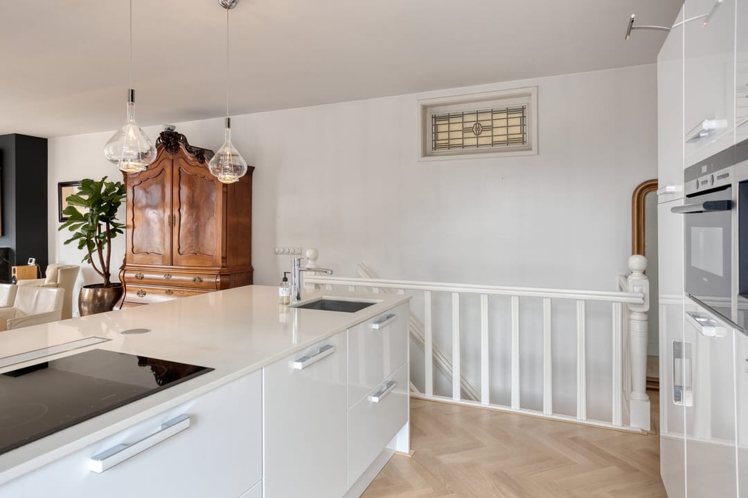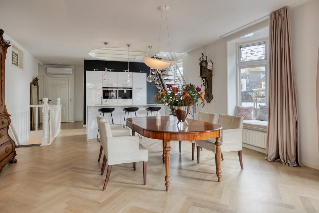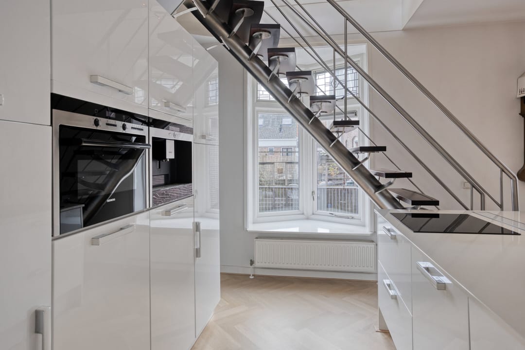 De eerste en tweede verdieping vormen samen een schitterend appartement met een lichte en moderne uitstraling. Op de eerste verdieping bevindt zich een royale en lichte woonkamer met gashaard en open keuken met kookeiland die van alle gemakken voorzien is. Verder is er een slaapkamer, een berging met wasmachineaansluiting en CV ketel. De nette badkamer met vloerverwarming heeft een bad, douche, dubbele wastafel, hangend closet en handdoekradiator. Separate toiletruimte met hangend closet en fonteintje.