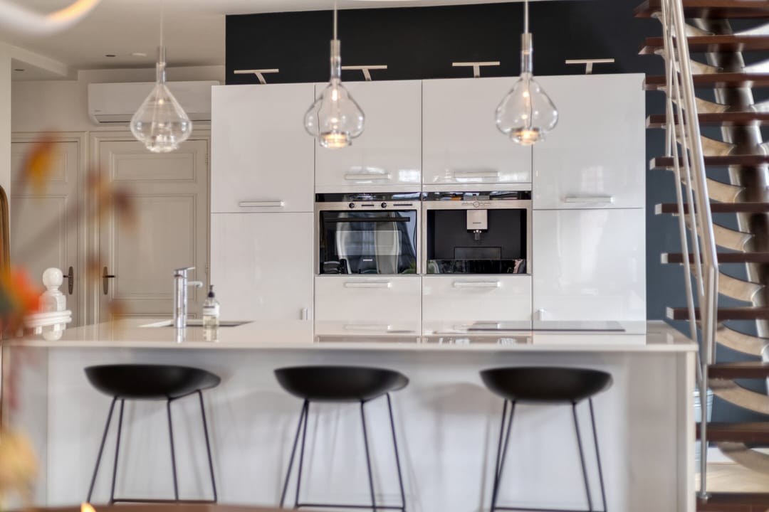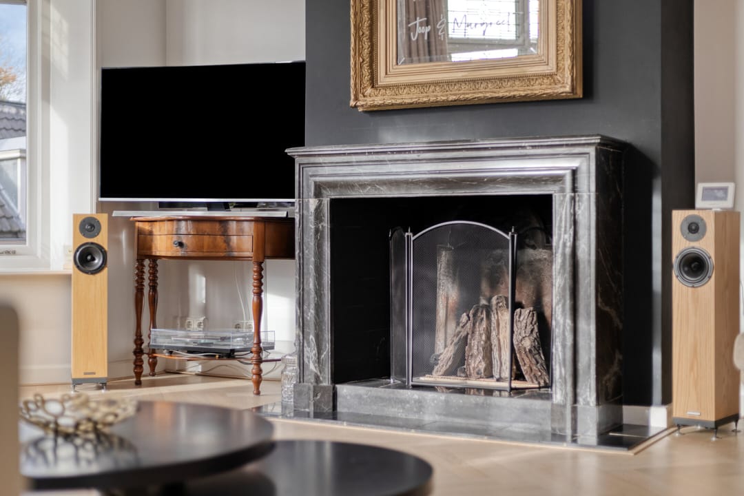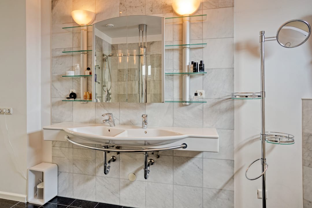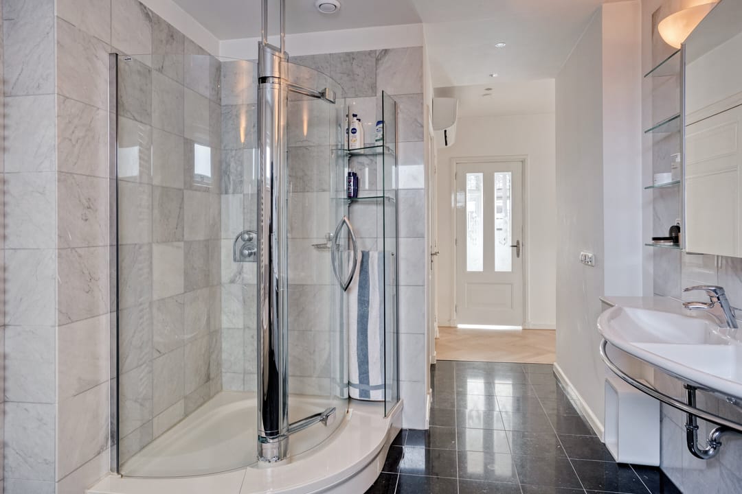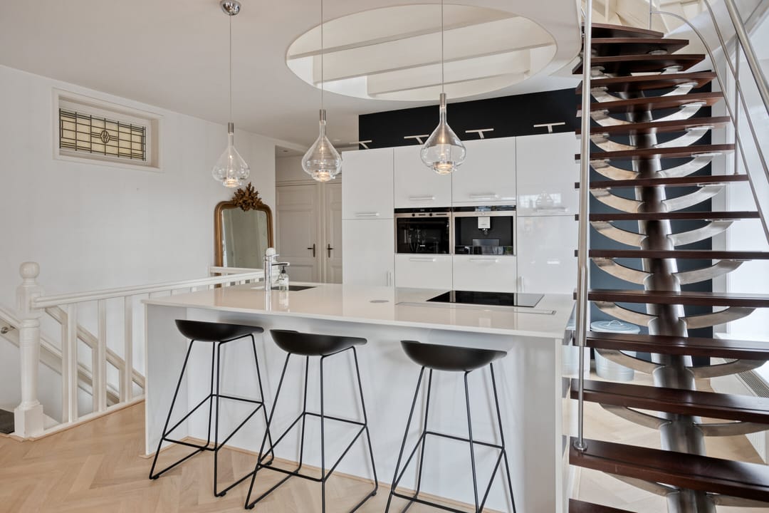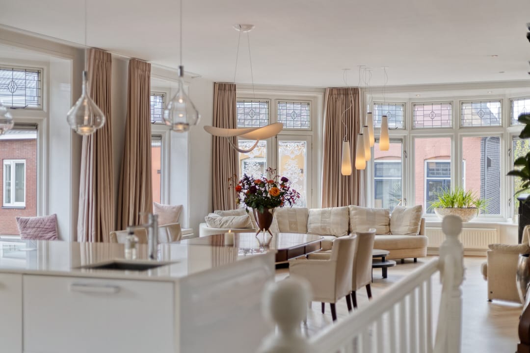De eerste en tweede verdieping vormen samen een schitterend appartement met een lichte en moderne uitstraling. Op de eerste verdieping bevindt zich een royale en lichte woonkamer met gashaard en open keuken met kookeiland die van alle gemakken voorzien is. Verder is er een slaapkamer, een berging met wasmachineaansluiting en CV ketel. De nette badkamer met vloerverwarming heeft een bad, douche, dubbele wastafel, hangend closet en handdoekradiator. Separate toiletruimte met hangend closet en fonteintje.