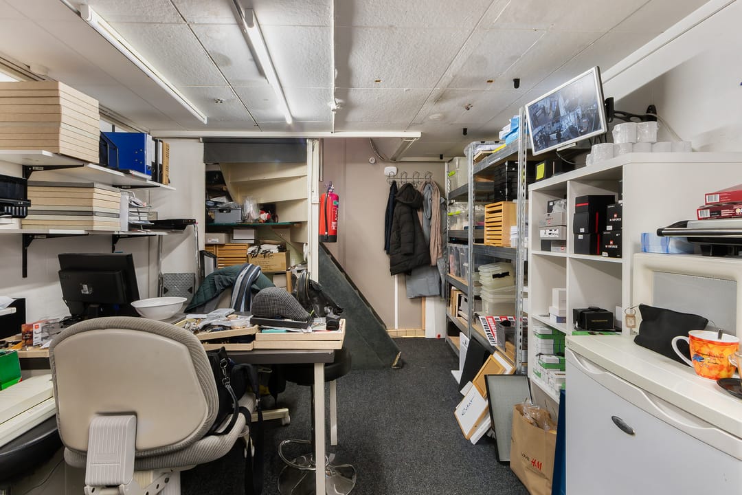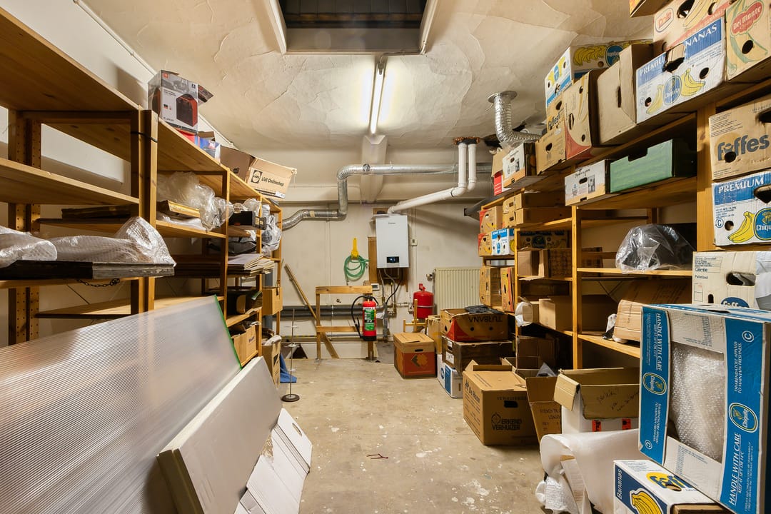 - Insteekverdieping (magazijn) met opstelplaats cv-combiketel (Vaillant, eco Tec plus, recente ketel), een betonnen vloer (m.u.v. achterste gedeelte, is hier een houten vloer), hangplaats unit mechanisch ventilatiesysteem, dichtgezet daklicht en opbouw tl-armaturen.