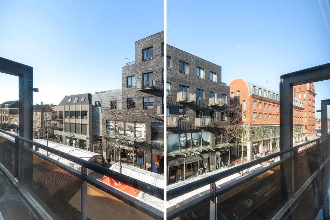 - Aluminium pui met een grote etalageruit en een loopdeur met aan weerszijden een doorlopende ruit (dik glas);