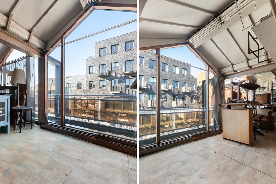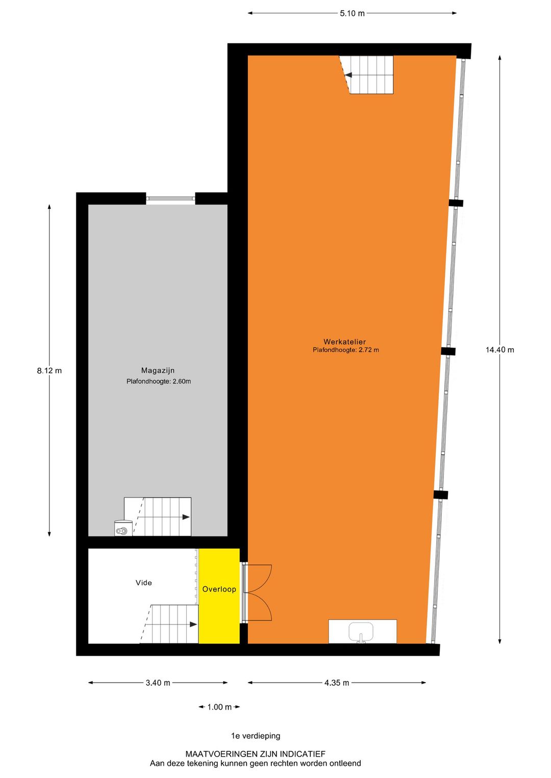Boven beide winkelruimten bevinden zich 2 verdiepingen, bereikbaar via een trappenhuis aan de achtergelegen Kromme Elleboog. De 1e verdieping (groot ca. 68 m² met grotendeels een betonnen vloer) is in gebruik geweest als werkatelier en de 2e verdieping (groot ca. 55 m² met een houten vloer) is in gebruik geweest t.b.v. opslagdoeleinden.