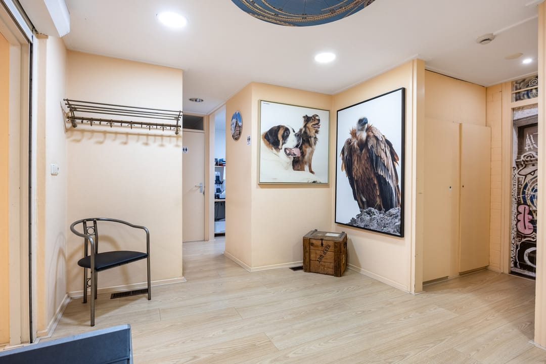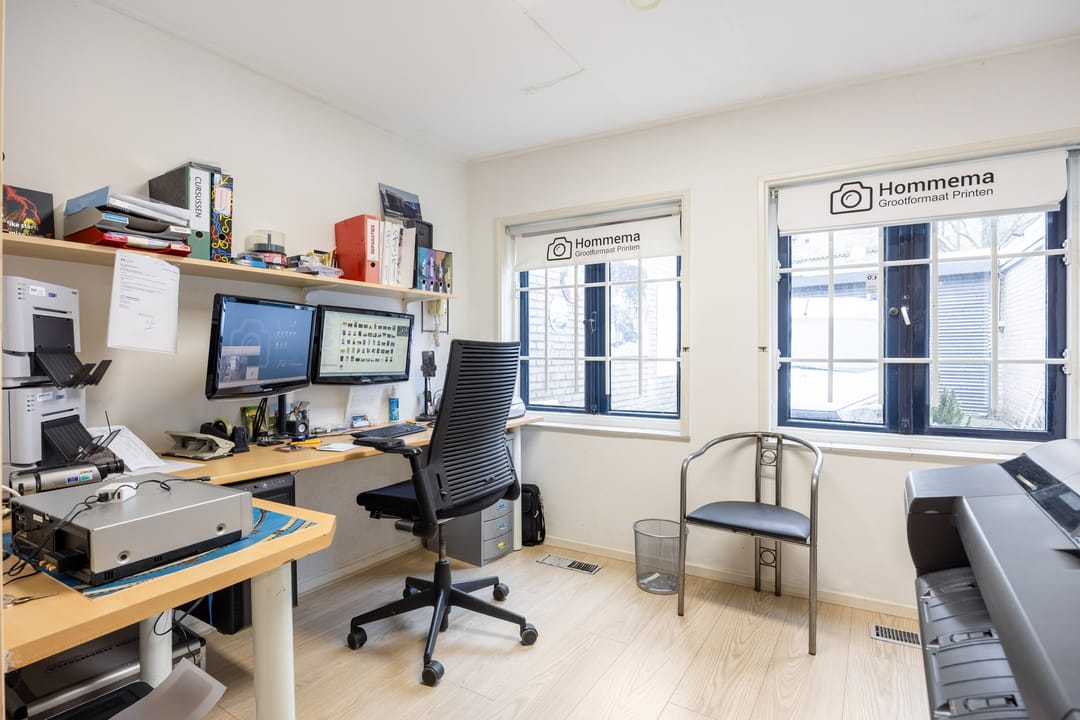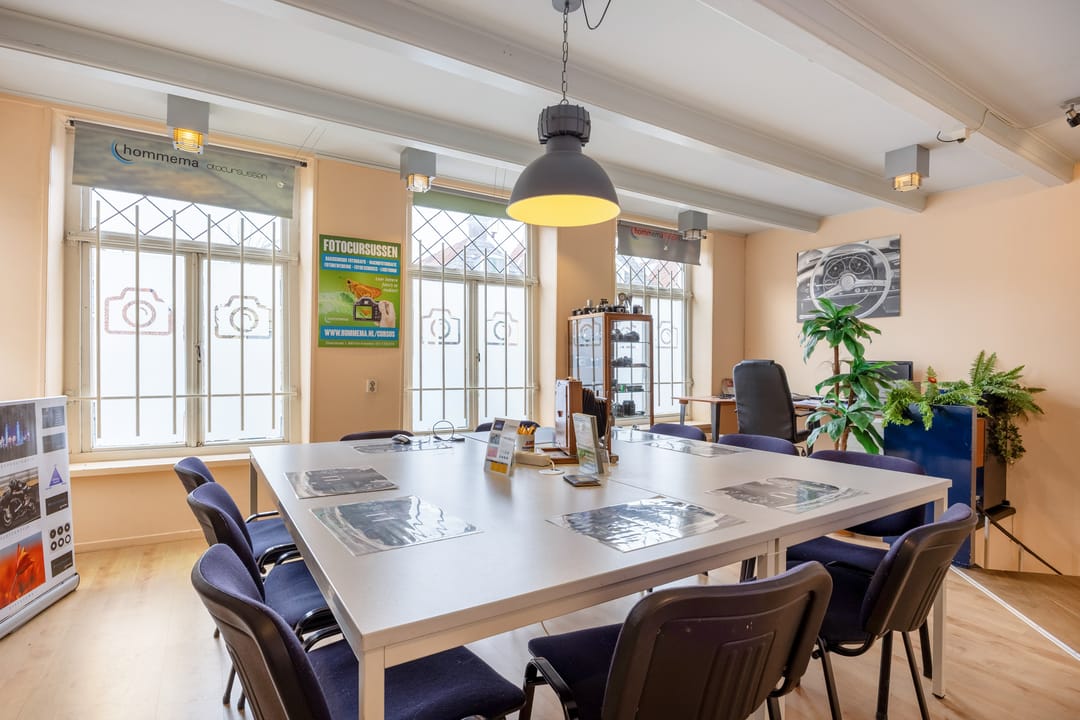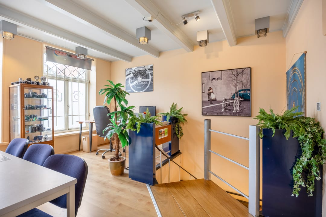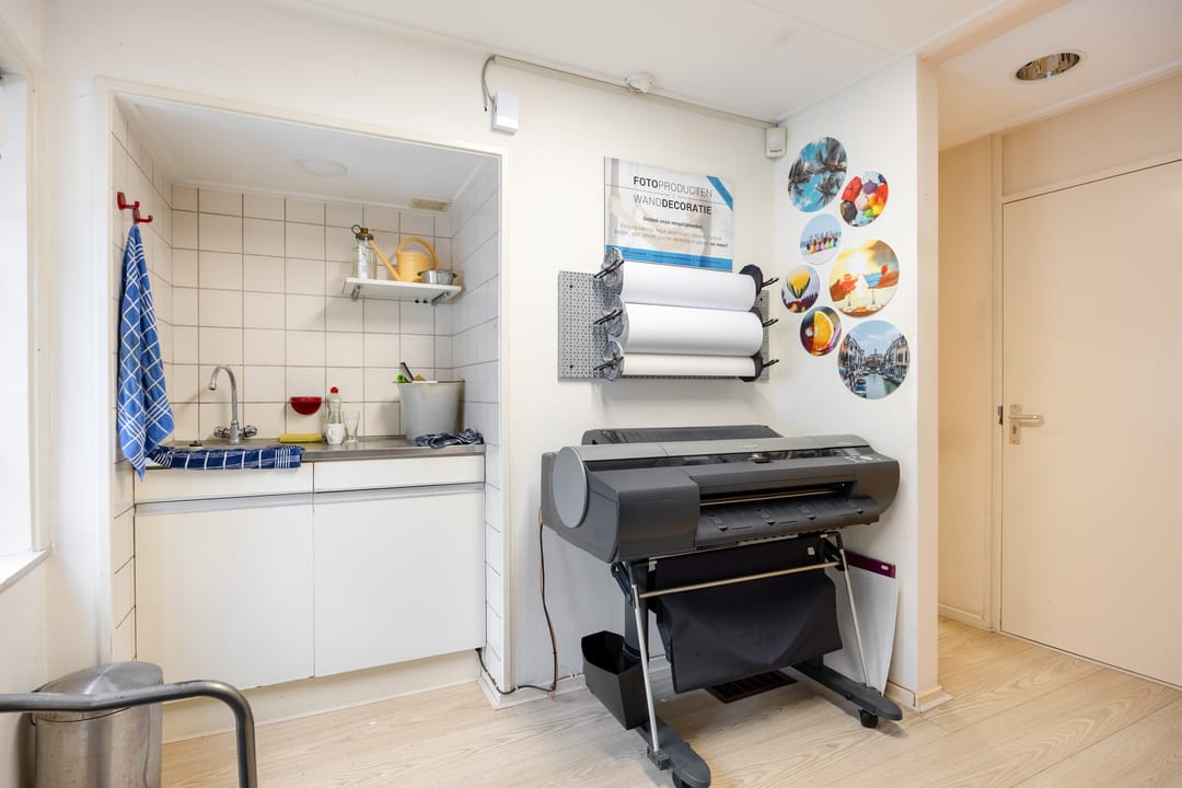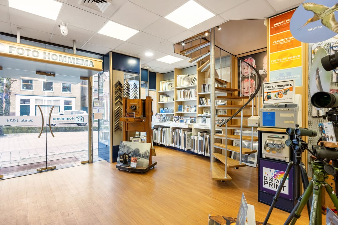 B.g.: entree via de grote glazen deuren in de brede pui met etalagevakken, grote multifunctionele (winkel)ruimte met wenteltrap naar de verdieping. Een opstapje leidt naar de 2de multifunctionele ruimte (studio). Daarachter bevindt zich een ruimte die nu gebruikt wordt als showroom en ruimte om zich voor te bereiden op de foto's. Er zijn 2 grote kastruimtes en tevens kom je vanaf hier bij het toilet en het kantoortje met een pantry. In de aanbouw is de achteringang en bergruimte voor de verschillende materialen. De eigen - beveiligde - parkeerplek bevindt zich aan de andere kant van de deur.