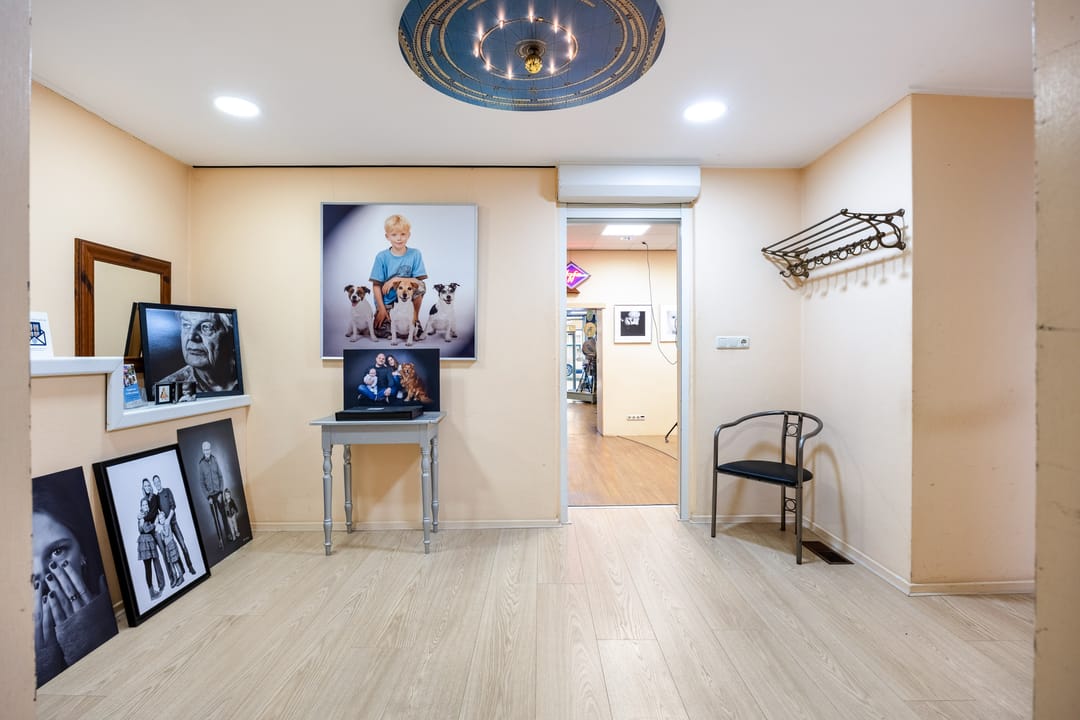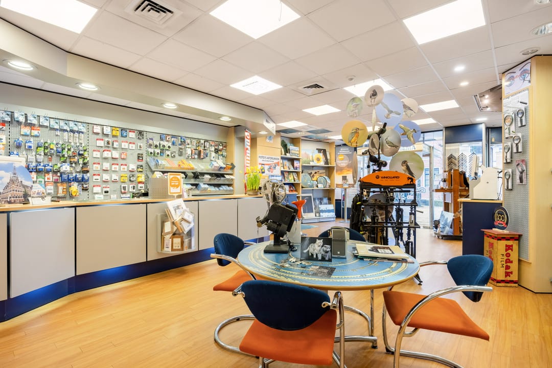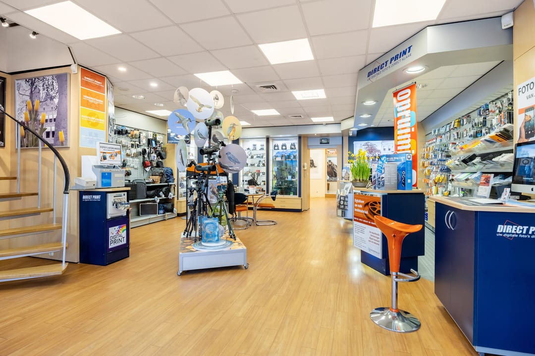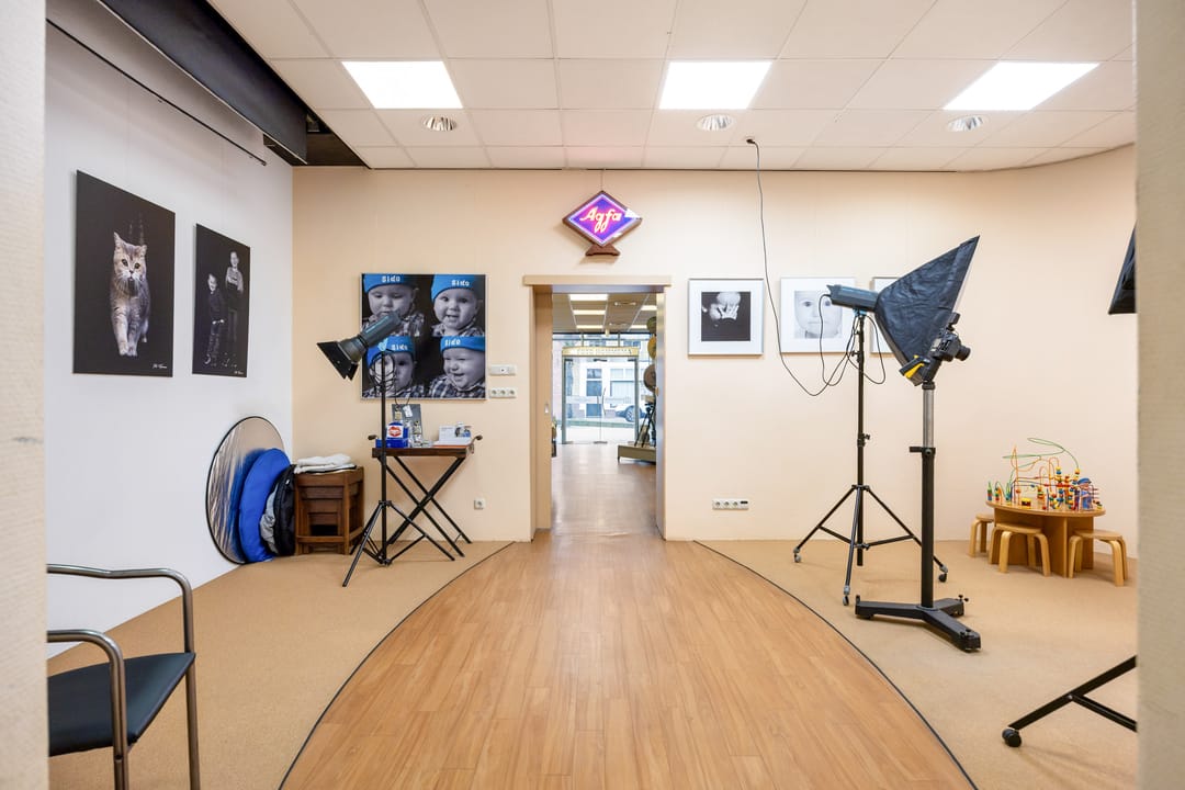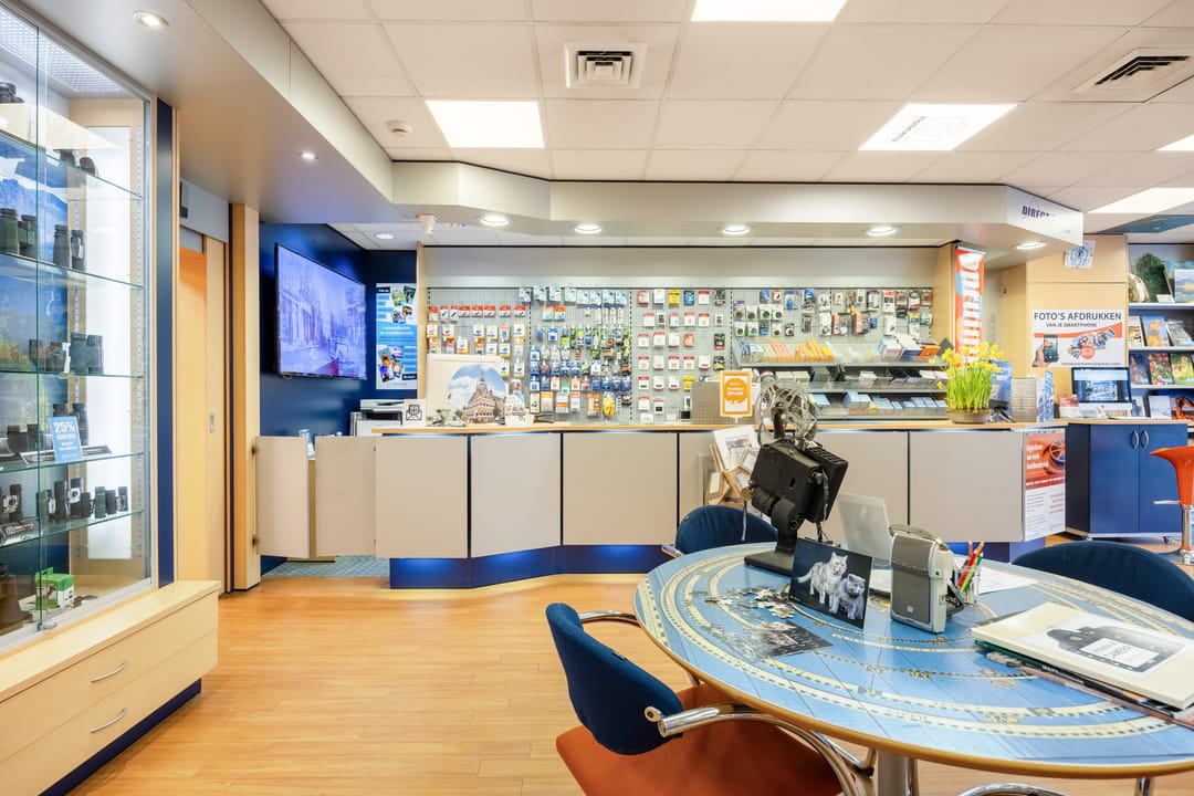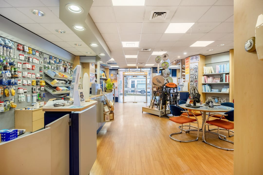 B.g.: entree via de grote glazen deuren in de brede pui met etalagevakken, grote multifunctionele (winkel)ruimte met wenteltrap naar de verdieping. Een opstapje leidt naar de 2de multifunctionele ruimte (studio). Daarachter bevindt zich een ruimte die nu gebruikt wordt als showroom en ruimte om zich voor te bereiden op de foto's. Er zijn 2 grote kastruimtes en tevens kom je vanaf hier bij het toilet en het kantoortje met een pantry. In de aanbouw is de achteringang en bergruimte voor de verschillende materialen. De eigen - beveiligde - parkeerplek bevindt zich aan de andere kant van de deur.