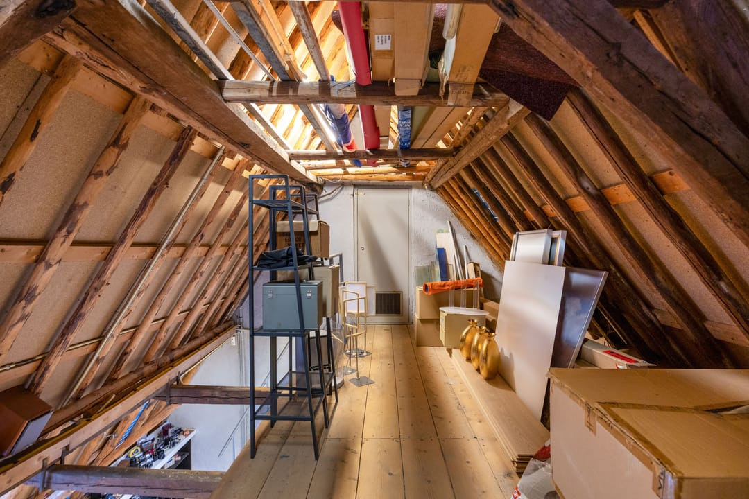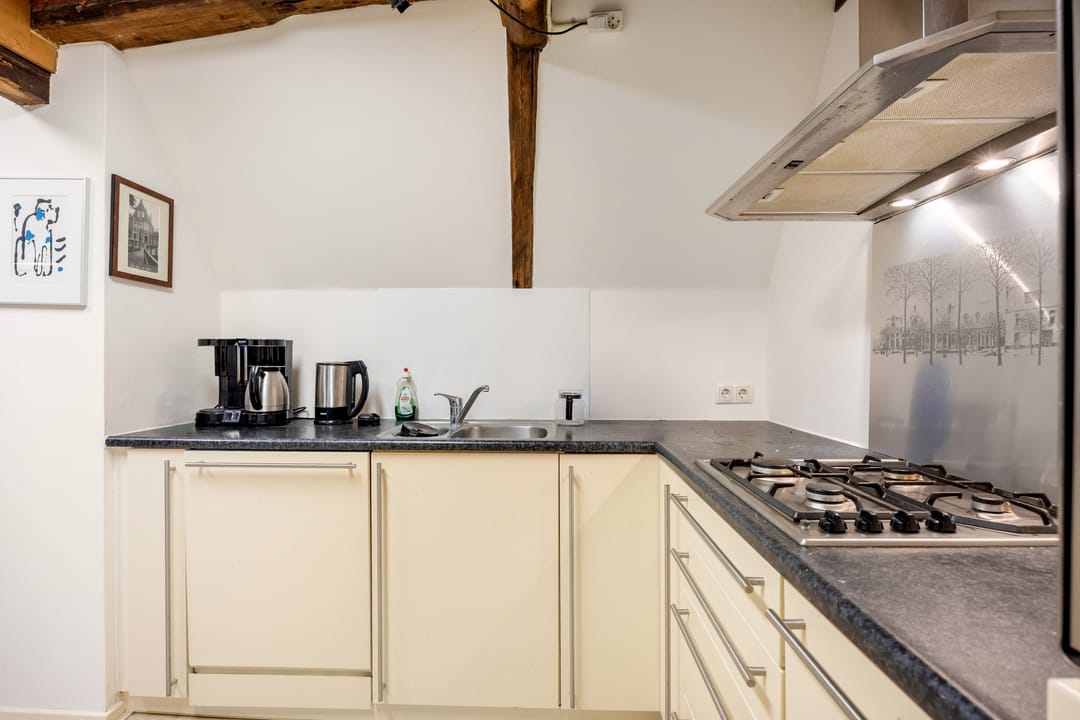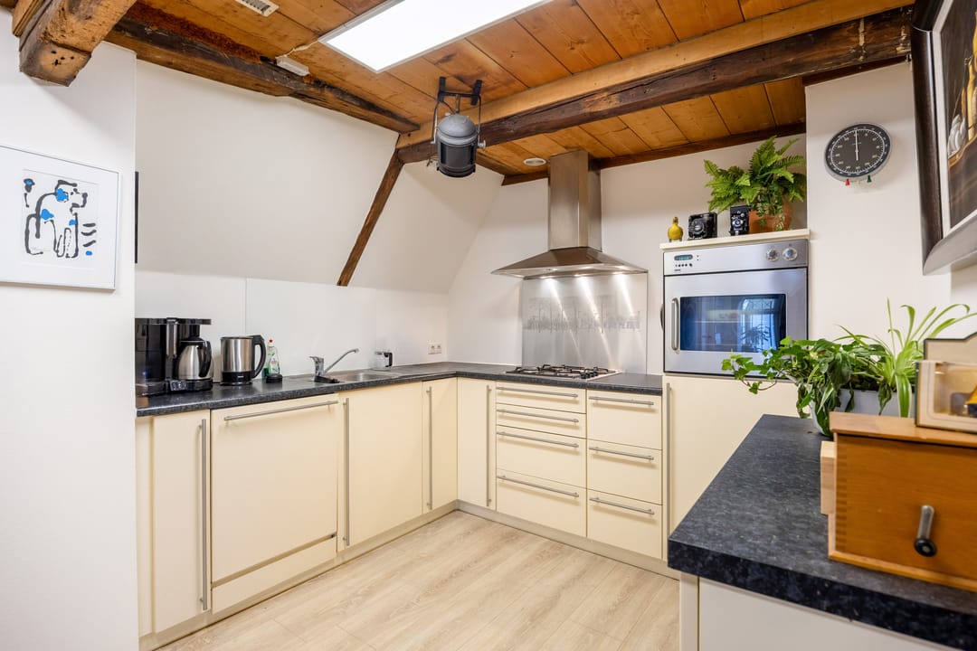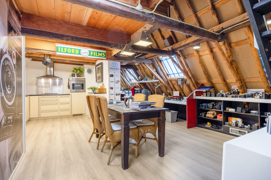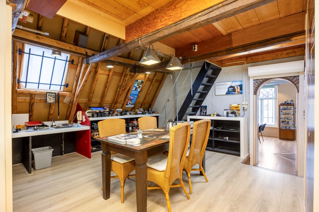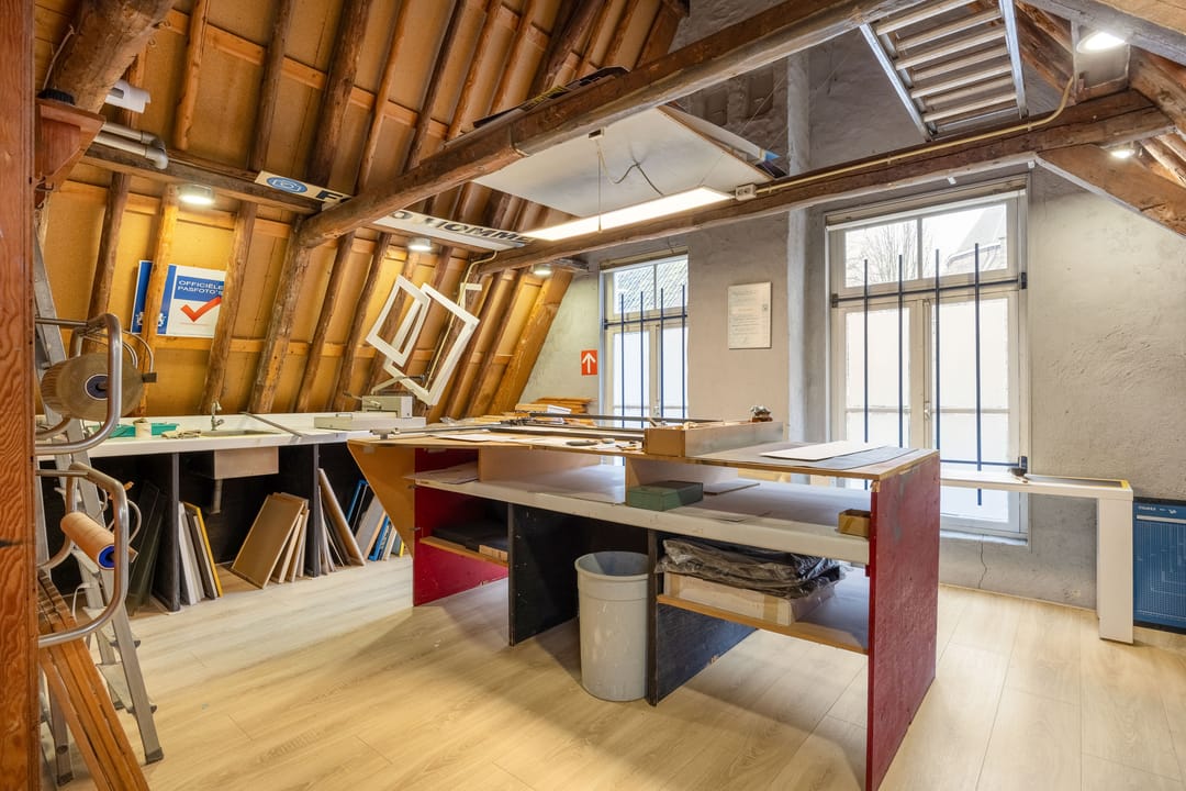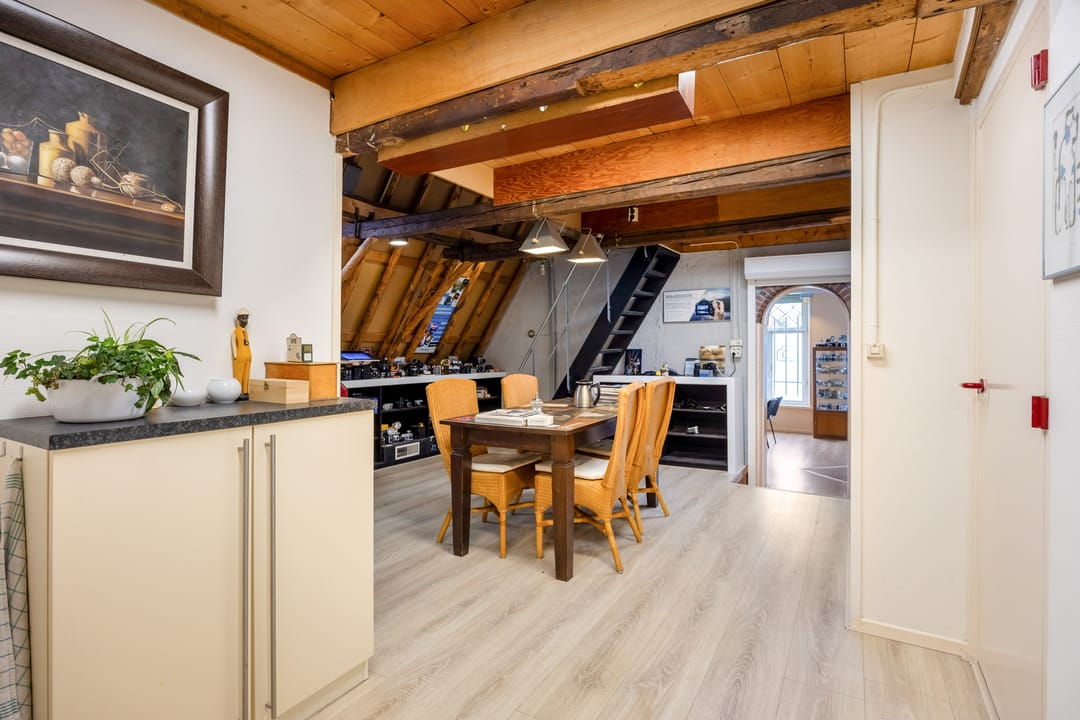 Boven (1ste verd.): grote, multifunctionele ruimte met grote ramen aan de voorzijde en uitzicht op de gracht. Een lichte ruimte die nu wordt gebruikt als workshop- en presentatieruimte, maar ook heel goed als woonkamer kan dienen. Twee traptreden brengen je in de volgende ruimte met een grote keuken (compleet met inbouwapparatuur). Hier wordt thans bijgepraat en gewerkt, maar hier zou je bijvoorbeeld een riante woonkeuken en leefruimte, en misschien wel een extra slaapkamer kunnen maken. Er is ook een grote berging en een voorraadkast. De gebinten zijn hier in het zicht, dat geeft de ruimte veel karakter en authenticiteit. Een vaste (steek)trap brengt je op de 2de verdieping met een hal, een berging en een slaapkamer aan de voorzijde, Verder is er veel bergruimte boven. Ook hier zou evt. slaapruimte kunnen worden gemaakt.