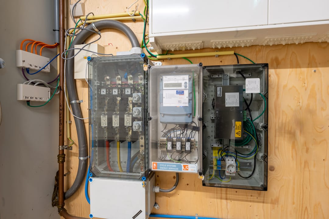 - Ingerichte meterkast met diverse groepenkasten, gecontracteerd transportvermogen E aansluiting bedraagt 101 kW, aansluitcapaciteit 155 kVA;