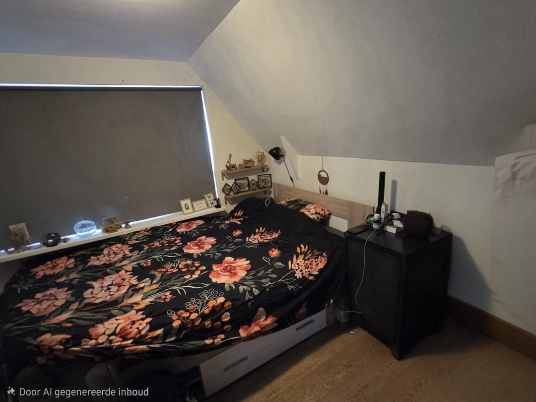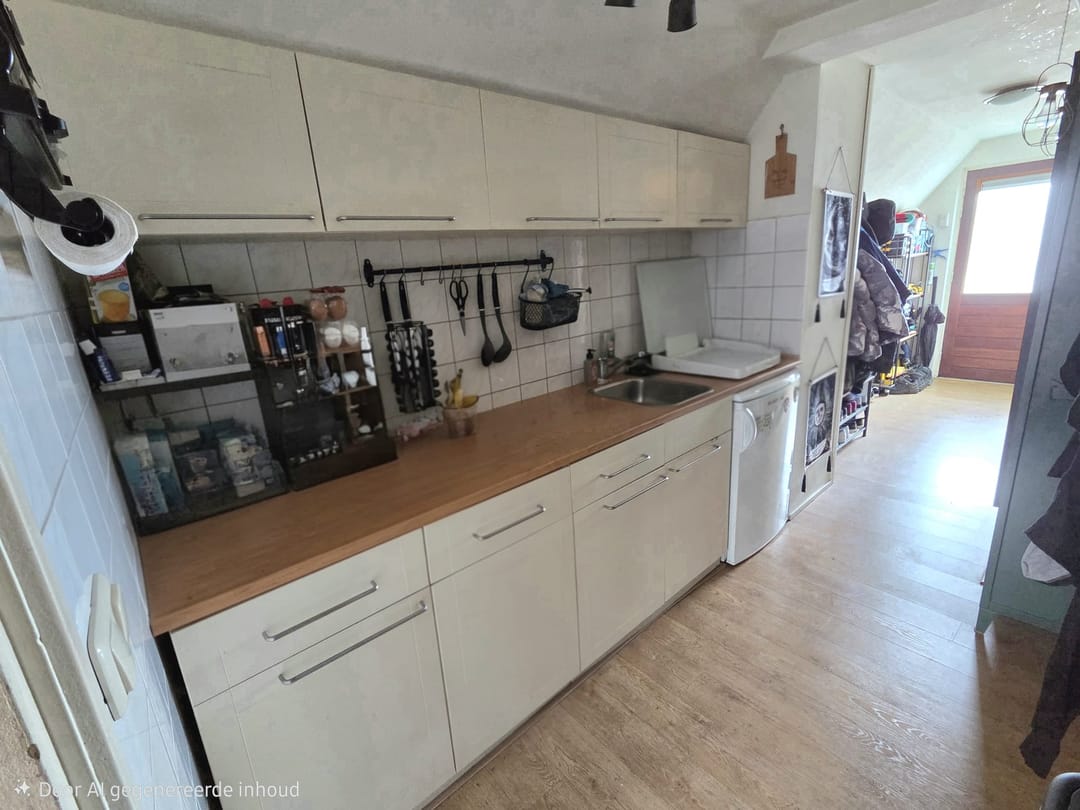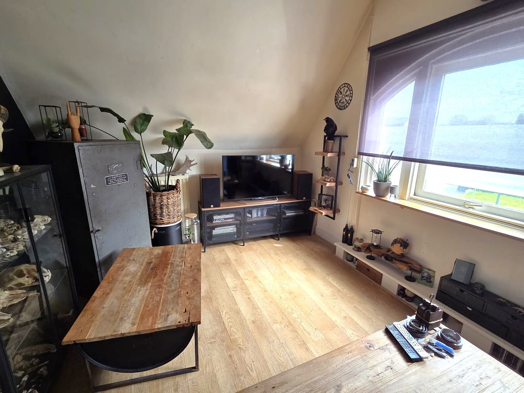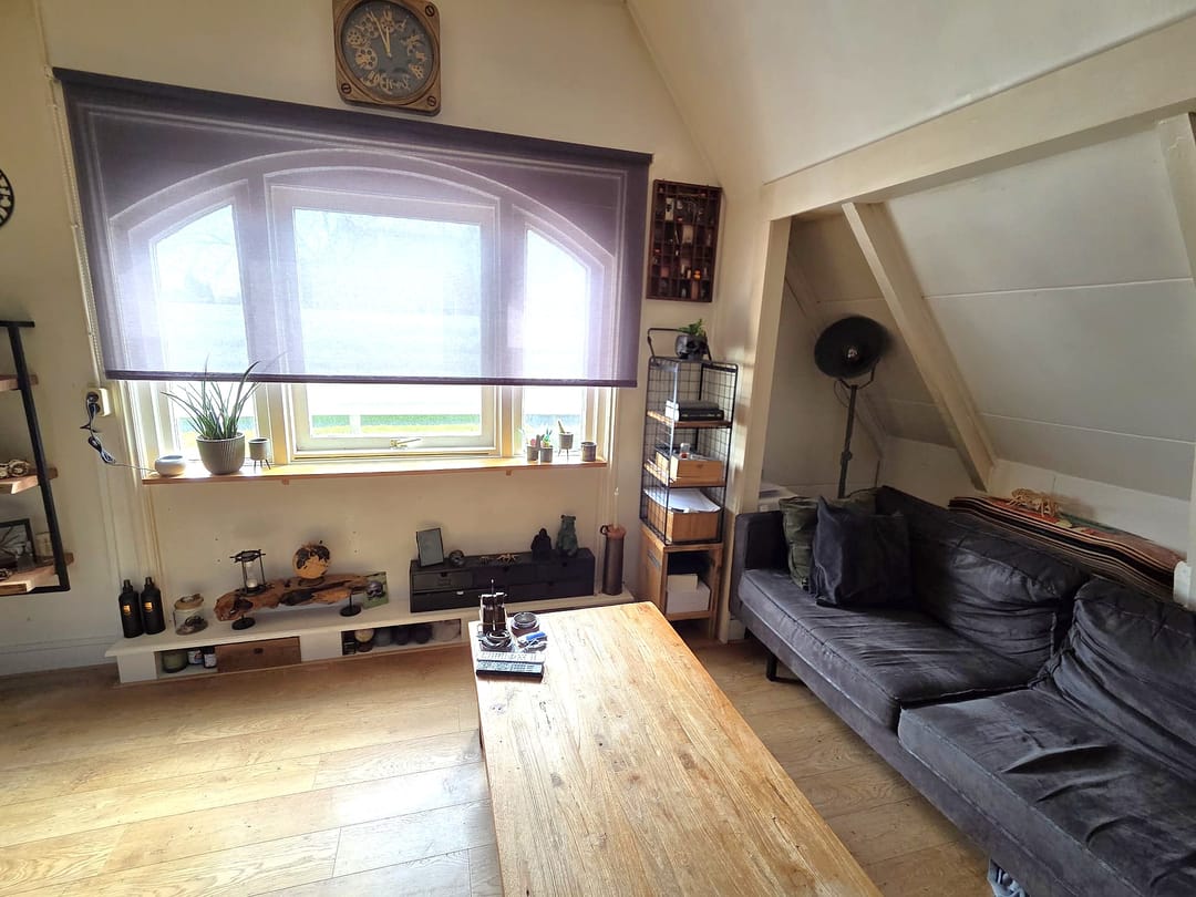 Entree via trap, hal, slaapkamer, douche, open keuken, sfeervolle woonkamer, berging.