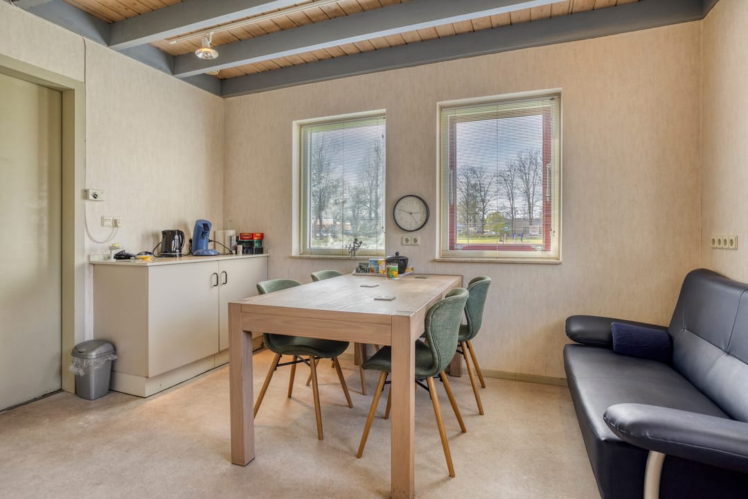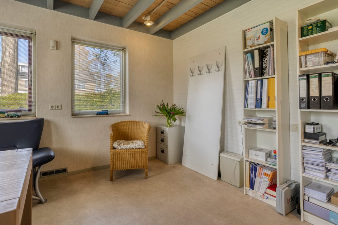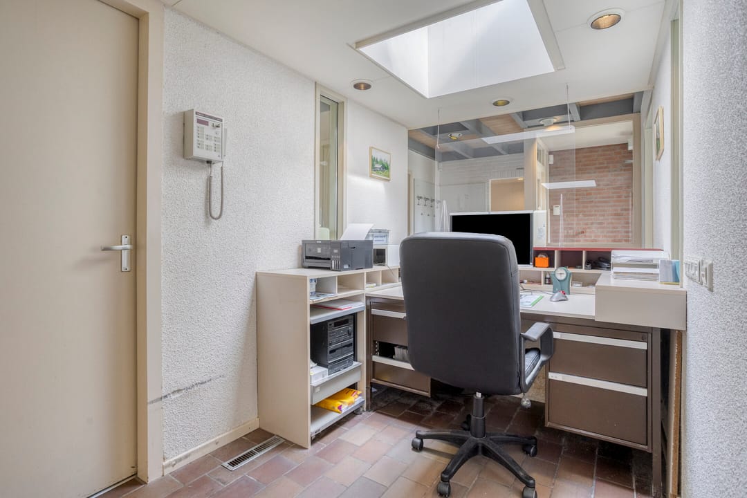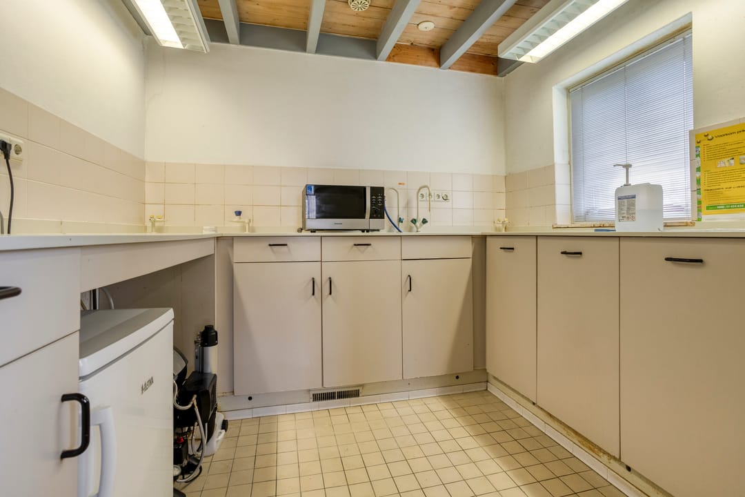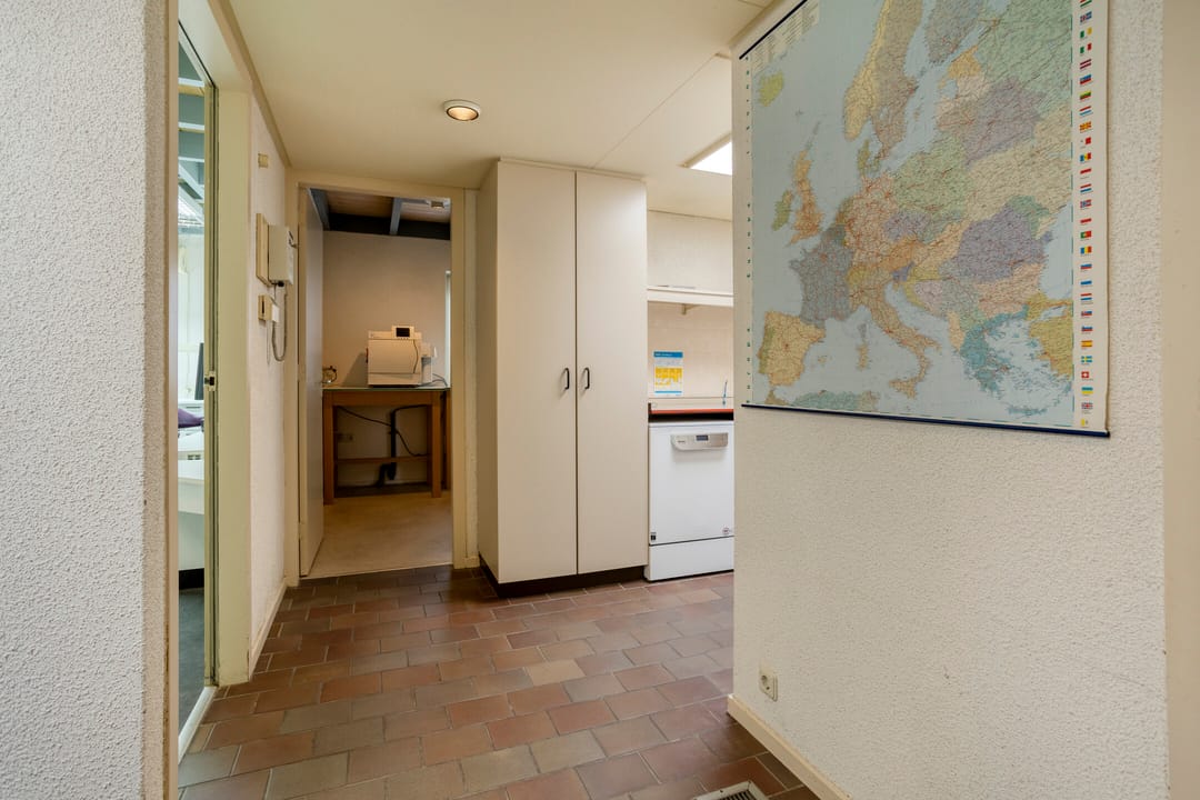 Entree met wachtkamer, grenzend aan de receptie. Twee behandelruimtes van vergelijkbare grootte, ca. 15 m², voorzien van wandmeubilair ten dienste van de praktijk, werkkamer met vaste keukenopstelling, kantine met pantry, verkeersruimte en sanitair. Afzonderlijke berging 9 m².