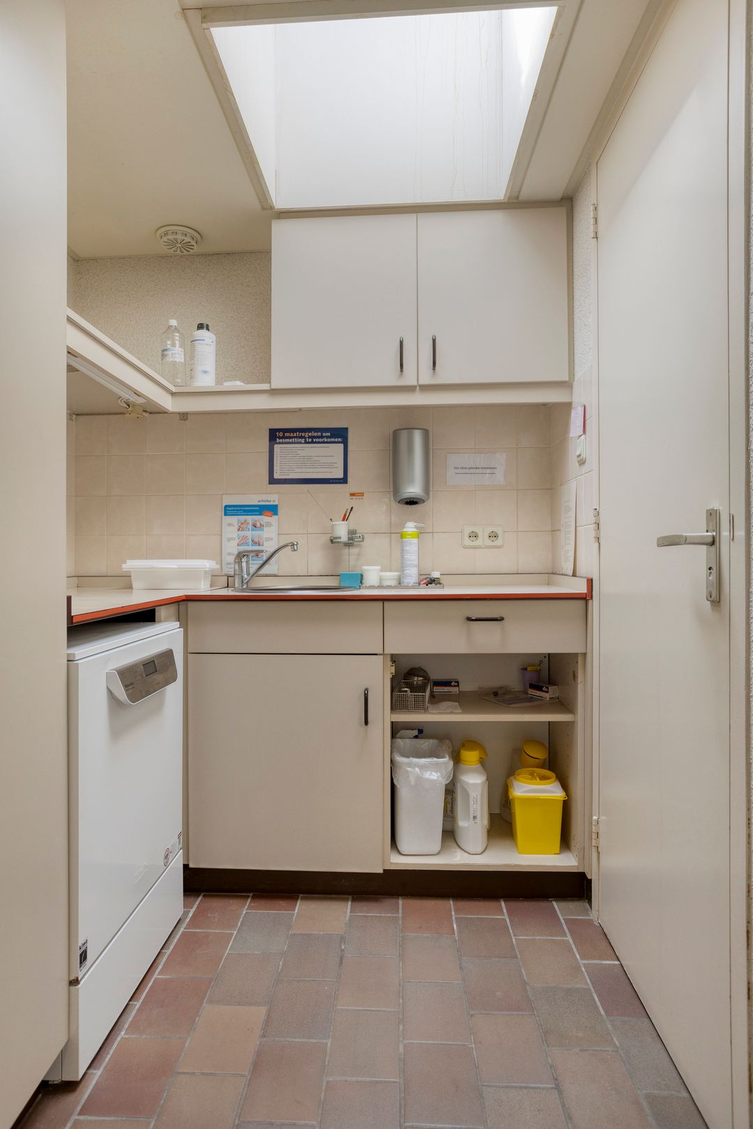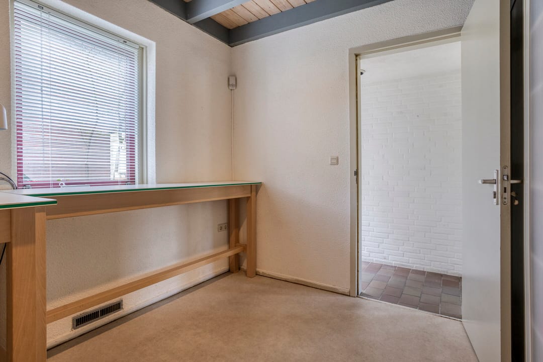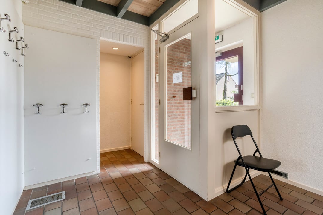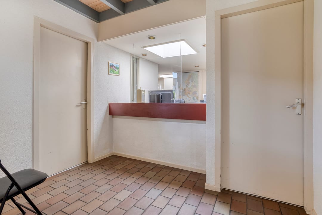 Entree met wachtkamer, grenzend aan de receptie. Twee behandelruimtes van vergelijkbare grootte, ca. 15 m², voorzien van wandmeubilair ten dienste van de praktijk, werkkamer met vaste keukenopstelling, kantine met pantry, verkeersruimte en sanitair. Afzonderlijke berging 9 m².
